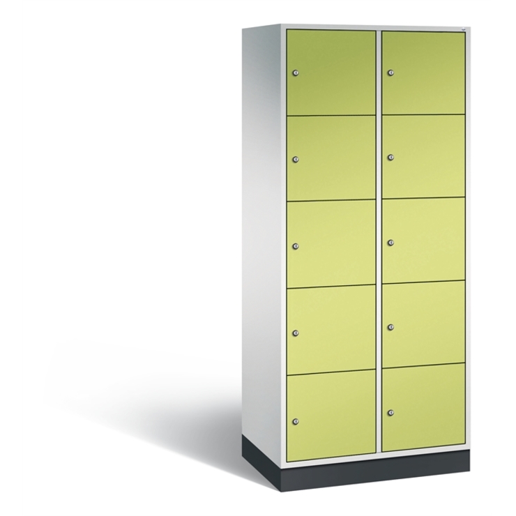 Stahl-Schließfachschrank Intro, XL, 2 Abteile mit 5 Fächern, Abteilbreite 400 mm, Korpus aus stabiler Stahlkonstruktion mit hochwertiger Einbrennbeschichtung für hohe UV- und Korrosionsbeständigkeit, Türen doppelwandig für hohe Stabilität, mit Anschlagsdämpfer, Türaufhängung durchgängig mit robustem Scharnierband, rechts angeschlagen, Rückwand mit großflächigem Luftdurchlass und 18 mm Wandabstandshaltern, auf 100 mm hohem Sockel, 10 Zylinderschlösser mit je 2 Schlüsseln, Schließkreis bis 1000 verschiedene Schließungen, Maße (H x B x T): 1950 x 820 x 490 mm, Korpus: RAL 7035 Lichtgrau, Türen: 1108060 RDS Viridingrün, Sockel: RAL 7021 Schwarzgrau