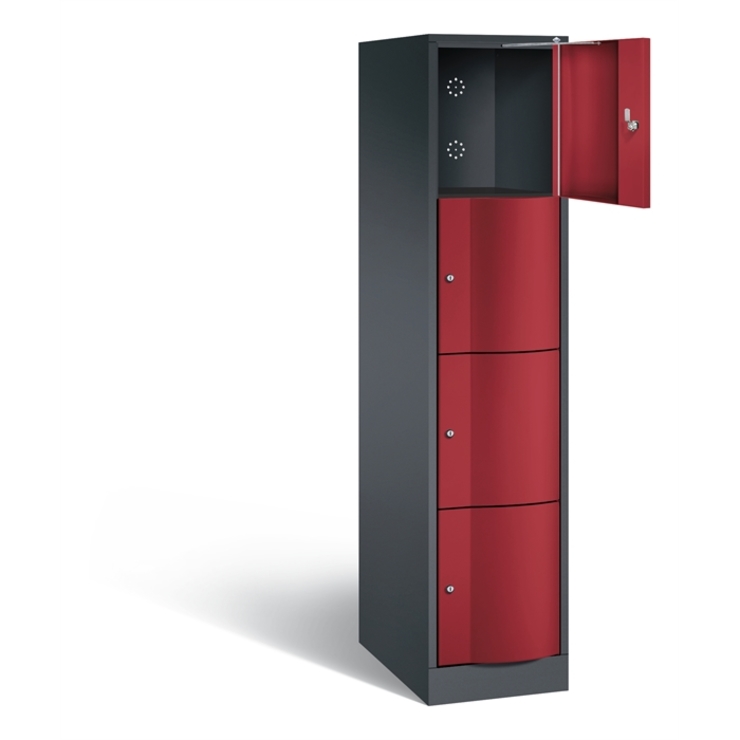 Stahl-Schließfachschrank Resisto, XL, 1 Abteil mit 4 Fächern, Korpus aus stabiler Stahlkonstruktion mit hochwertiger Einbrennbeschichtung für hohe UV- und Korrosionsbeständigkeit, Spezialtüren aus 1,5 mm Stahl, mit Wölbung nach vorne, absolut stabil und vandalismussicher, mit Anschlagsdämpfer, Türaufhängung durchgängig mit robustem Drehstangen- Scharnier, rechts angeschlagen, Rückwand mit großflächigem Luftdurchlass und 18 mm Wandabstandshaltern, auf 100 mm hohem Sockel mit 30 mm Niveauregulierung, 4 Drehzylinderschlösser mit 2 Schlüsseln, Schließkreis bis 6000 verschiedene Schließungen, Maße (H x B x T): 1950 x 396 x 640 mm, Korpus: RAL 7021 Schwarzgrau, Türen: RAL 3003 Rubinrot