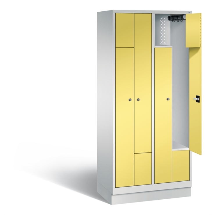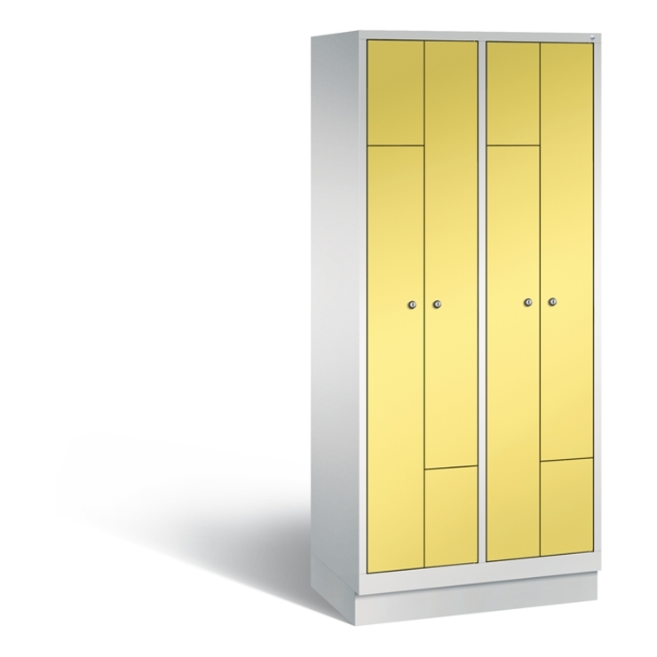 Stahl-Z-Garderobenschrank Classic, 2 Abteile jeweils z-förmig unterteilt für 4 Personen, komfortable Hängemöglichkeit langer Kleidungsstücke trotz geringem Platzangebot, Z-Türen mit speziellem Faltmechanismus und Anschlagsdämpfer, doppelwandig für hohe Stabilität, Türaufhängung durchgängig mit robustem Drehstangen-Scharnier, innen je Fach 1 stabile Garderobenstange aus Ovalprofil mit 3 verdrehsicheren Schiebehaken, mit Belüftungs-Lochbild in der Rückwand und 10 mm Wandabstandhalter, auf 100 mm hohem Sockel mit verstellbaren Bodengleitern für einfachen Niveauausgleich 2 Zylinderschlösser mit je 2 Schlüsseln, Schließkreis bis 1000 verschiedene Schließungen, Maße (H x B x T): 1820 x 820 x 510 mm, Korpus: RAL 7035 Lichtgrau, Türen: 0959059 RDS Schwefelgelb, Sockel: RAL 7035 Lichtgrau