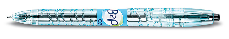 Gelschreiber B2P BEGREEN Bottle to pen. Ausführung der Vorschubmechanik: Druckmechanik. Typbezeichnung der Mine: 2606 BLS-G2 7. Art der Schreibflüssigkeit: Geltinte. Ausführung Mine: 0,4 mm, schwarz, Mine auswechselbar. Ausführung Stift: Kunststoff, Material des Clips: Kunststoff. Druckknopf am Schaftende in Schreibfarbe. Das Gehäusedesign entspricht dem einer Wasserflasche. Besteht zu 89,8% aus recyceltem Material (Berechnungen beziehen sich auf Gehäuse insbesondere ohne Verbrauchsmaterialien wie Mine, Tinte und Radierer). Farbe des Schaftes: transluzent.