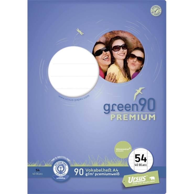 Vokabelheft LIN54 A4 40 Blatt 90 g/qm liniert mit 2 MST Mittelstrich, Ursus® Green - Das Verantwortungsbewusste! Produkt im youth culture - eco design, hergestellt aus premiumweißem Schreibpapier ohne optische Aufheller, ohne Chlorbleiche, zu 100 % Recycling, ausgezeichnet mit dem Umweltzeichen Blauer Engel - weil aus 100 % Recyclingpapier, klimaneutral produziert.
