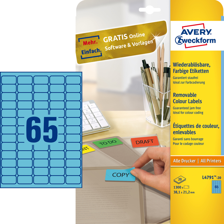 Die blauen, wiederablösbaren Etiketten L4791-20 im Format 38,1x21,1mm von AVERY ZWECKFORM eignen sich z.B. zum temporären farbigen Beschriften von Unterlagen und Ablagen. 1300 Etiketten auf 20 Bogen. Die farbigen Etiketten haften fest und sind problemlos wiederablösbar, ohne Kleberückstände zu hinterlassen. Sie können sich auf einen absolut staufreien Druckerdurchlauf ohne Klebstoffablagerungen im Drucker verlassen. Gestalten und drucken Sie Ihre Aufkleber schnell und einfach - mit den kostenlosen Avery Zweckform Etiketten Vorlagen und Software-Lösungen unter www.avery-zweckform.eu / print oder den im Microsoft® Office Paket integrierten Basis-Vorlagen. Geeignet für alle gängigen Farb- / Laser- und Inkjetdrucker und Kopierer.