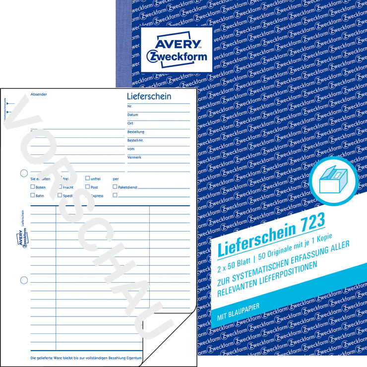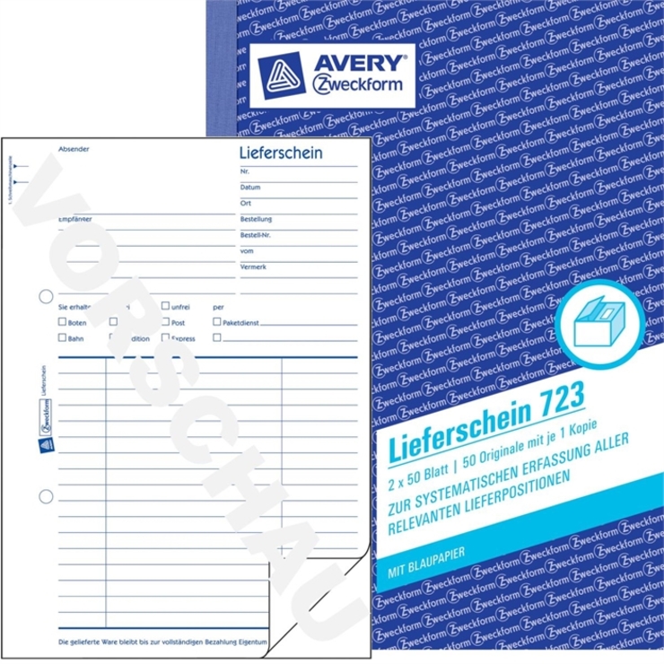 Der Lieferschein 723 von AVERY ZWECKFORM im DIN A5 Format hilft Ihnen bei der systematischen Erfassung aller relevanten Lieferpositionen. Die Liefer- / Versandart ist bereits vorgegeben und kann angekreuzt werden. Das Lieferscheinbuch beinhaltet 50 vorgedruckte weiße Lieferscheine mit jeweils 1 weißen Blanko Duchschlag ohne Perforation zum Verbleib im Buch; und 1 Blatt Blaupapier. Die Lieferschein Vorlagen und Vordrucke von Avery Zweckform sind zuverlässige, bewährte Hilfen für Ihre Warenwirtschaft, Buchhaltung und Steuer und werden regelmäßig von Rechtsexperten geprüft.