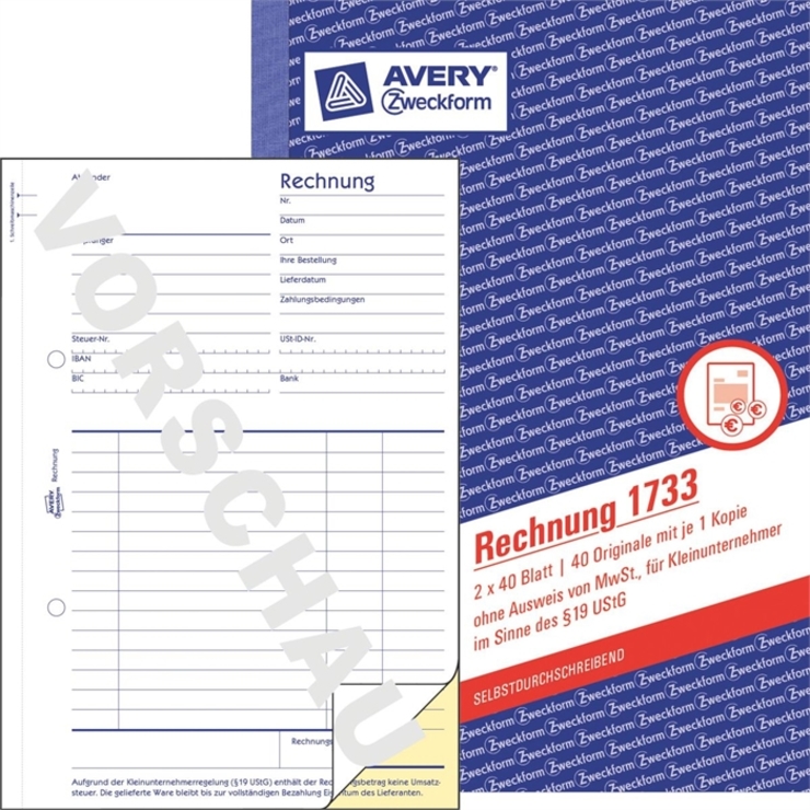 Die Rechnung für Kleinunternehmer 1733 von AVERY ZWECKFORM im DIN A5 Format ist zur Verwendung speziell durch Kleinunternehmer gemäß §19 des Umsatzsteuergesetzes (UStG) geeignet, da Kleinunternehmer in ihren Rechnungen keine Mehrwertsteuer ausweisen dürfen. Das Rechnungsbuch beinhaltet 40 vorgedruckte Rechnungsvorlagen mit jeweils einem selbstdurchschreibenden, gelben Durchschlag. Die Rechnungsvorlagen und Vordrucke von Avery Zweckform sind zuverlässige, bewährte Hilfen für Ihre Warenwirtschaft, Buchhaltung und Steuer und werden regelmäßig von Rechtsexperten geprüft.