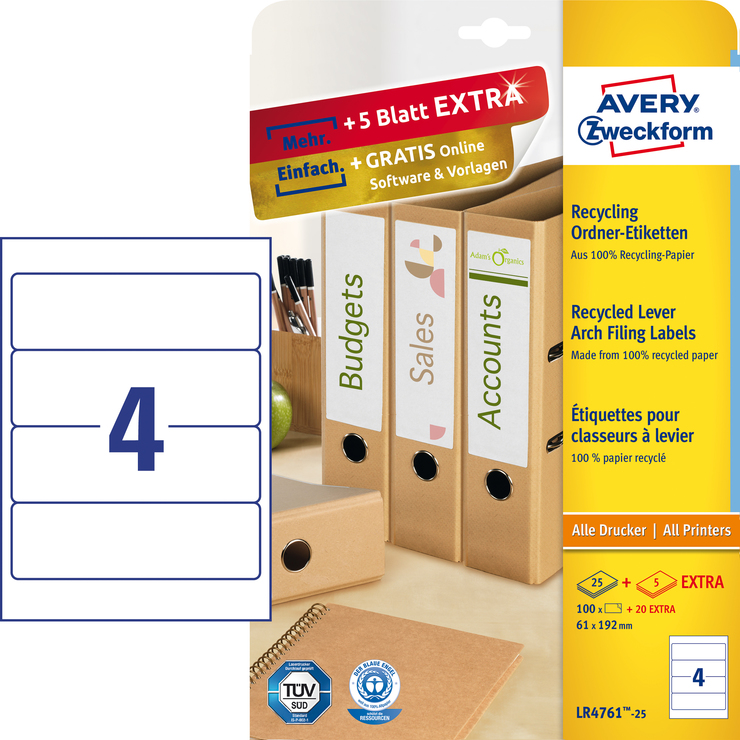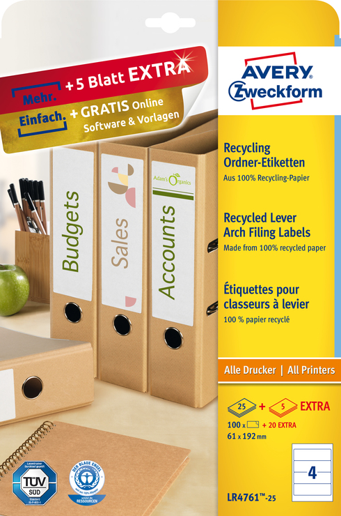 Mehr Inhalt: + 5 Blatt EXTRA! Die naturweißen Recycling Ordner-Etiketten LR4761-25 im Format 61x192mm (kurz) von AVERY ZWECKFORM kleben dauerhaft sicher auf allen gängigen breiten Standard-Ordnern wie z.B. Leitz, Melba, Mehle, Bene und Biella. 100 + 20 Ordneretiketten EXTRA auf 25 + 5 Bogen EXTRA. Sie bestehen aus 100% chlorfrei gebleichten Altpapier und sind mit dem Umweltzeichen ""Blauer Engel"" zertifiziert. Die Ordnerrücken-Aufkleber lassen sich mit allen gängigen Farb / Laser- und Inkjetdruckern und Kopierern bedrucken. Sie können sich auf einen garantiert staufreien Druckerdurchlauf verlassen. Problemloser Druckerdurchlauf für Laserdrucker getestet und bestätigt durch TÜV SÜD. Gestalten und drucken Sie Ihre Ordnerrücken schnell und einfach - mit den kostenlosen Avery Zweckform Etiketten Vorlagen und Software-Lösungen unter www.avery-zweckform.eu / print oder den im Microsoft® Office Paket integrierten Basis-Vorlagen.