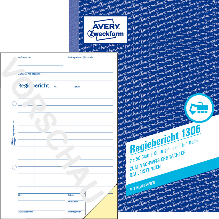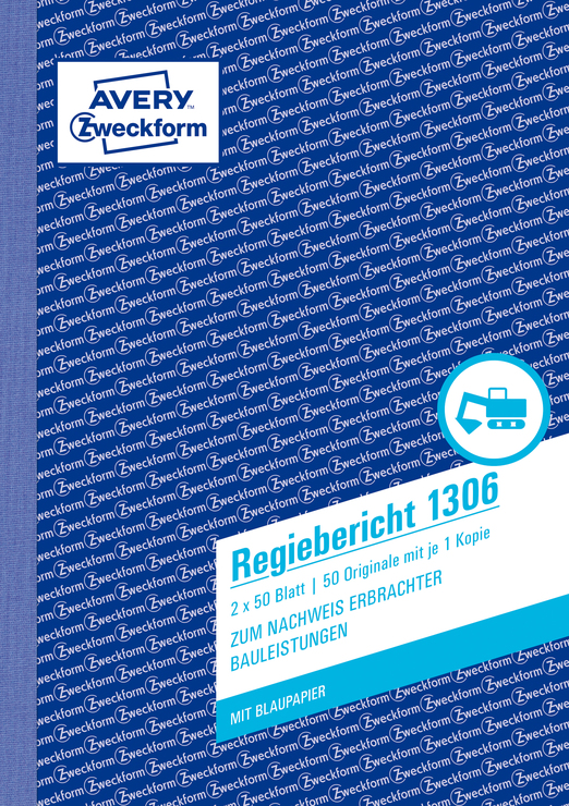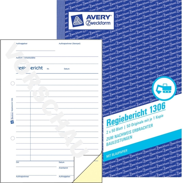 Der Regiebericht 1306 von AVERY ZWECKFORM im DIN A5 Format eignet sich besonders, um die Arbeitsleistung und den Materialverbrauch auf dem Bau zu dokumentieren. Der Regiebericht beinhaltet 2 x 50 Blatt, jeweils ein bedrucktes weißes Blatt mit einem gelben bedruckten Durchschlag, und 2 Blatt Blaupapier. Die Bauformulare, Bauvordrucke und Regiebericht Vorlagen von Avery Zweckform sind zuverlässige, bewährte Hilfen für Bau und Handwerk.
