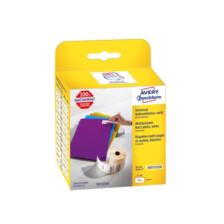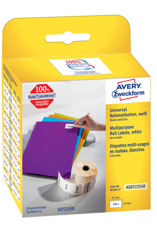 Die weißen, wiederablösbaren Universal Rollenetiketten AS0722550 im Format 19x51mm von AVERY ZWECKFORM bieten Ihnen für jeden Bedarf das passende Etikett. Die Aufkleber sind 100% kompatibel mit dem Dymo® Labelwriter™ LW310, LW330T, LW400 Serie, LW450 Serie. Diese Thermoetiketten entsprechen dem Dymo® Artikel S0722550. 500 Etiketten auf Rolle pro Packung. Die Rollenetiketten zeichnen sich durch eine überdurchschnittlich gute Klebkraft aus (gemessen nach FTM2 und FTM9 auf allen gängigen Oberflächen) und sie sind frei von Bisphenol A (BPA). Wir garantieren vollste Zufriedenheit für die Avery Zweckform Rollenetiketten, oder Sie erhalten Ihr Geld zu 100% zurück (Teilnahmebedingungen unter www.avery-zweckform.de). Gestalten und drucken Sie je nach Bedarf einzelne oder auch mehrere Aufkleber schnell und einfach selbst mit Ihrer Dymo® Software.