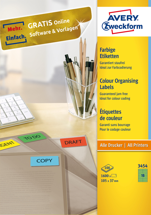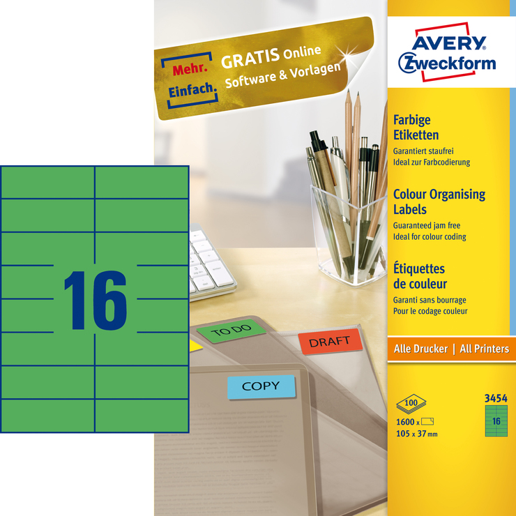 Die grünen, permanent haftenden Etiketten 3454 im Format 105x37mm von AVERY ZWECKFORM eignen sich z.B. für eine thematische Farbcodierung Ihrer Dokumente. 1600 Etiketten auf 100 Bogen. Sie können sich auf einen absolut staufreien Druckerdurchlauf ohne Klebstoffablagerungen im Drucker verlassen. Gestalten und drucken Sie Ihre Aufkleber schnell und einfach - mit den kostenlosen Avery Zweckform Etiketten Vorlagen und Software-Lösungen unter www.avery-zweckform.eu / print oder den im Microsoft® Office Paket integrierten Basis-Vorlagen. Farbige Etiketten geeignet für alle gängigen Farb- / Laser- und Inkjetdrucker und Kopierer.