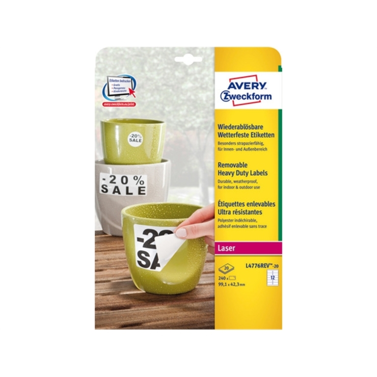 Die weißen, wetterfesten Etiketten L4776REV-20 im Format 99,1x42,3mm für Laserdrucker von AVERY ZWECKFORM zeichnen sich durch eine extreme Strapazierfähigkeit im Innen- und Außenbereich aus. 240 matt beschichtete Polyester-Folienetiketten auf 20 Bogen.Die Aufkleber haften sehr stark und sind dabei wiederablösbar, ohne Kleberückstände zu hinterlassen und eigenen sich dadurch besonders z.B. für Promotions und temporäre Produkt- und Eigentumskennzeichnung. Die reiß- und wasserfesten Folienetiketten sind deutlich strapazierfähiger als Papier-Etiketten, öl-, schmutz-, UV- und temperaturbeständig (-20° bis +80°C). Gestalten und drucken Sie Ihre wetterfesten Aufkleber schnell und einfach - mit den kostenlosen Avery Zweckform Etiketten Vorlagen und Software-Lösungen unter www.avery-zweckform.eu / print oder den im Microsoft® Office Paket integrierten Basis-Vorlagen. Geeignet für alle gängigen Laser- und Farblaserdrucker.