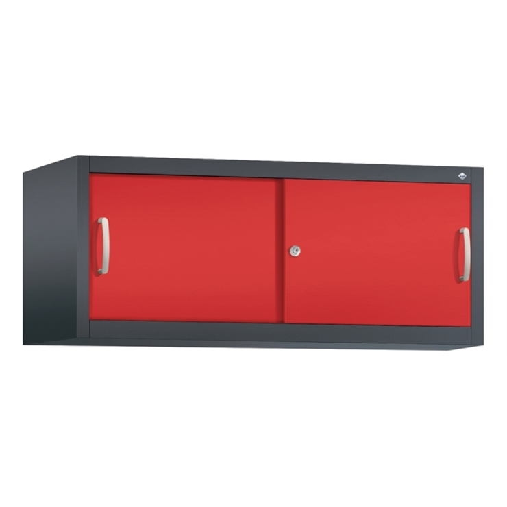 Stahl-Schiebetürenschrank Acurado-2000, als Aufsatzschrank, Korpus aus stabiler Stahlkonstruktion mit hochwertiger Einbrennbeschichtung für hohe UV-Beständigkeit, mit Kunststoffgleitern als praktischer Schrank- und Fußbodenschutz, hohe Flexibilität der Inneneinrichtung durch Höhenverstellbarkeit im 15 mm Raster, Türen verstärkt für hohe Stabilität, leichtgängige Bedienung durch Leichtlaufrollen in spezieller Schienenführung, 1 Wechselzylinder matt vernickelt mit 2 Schlüsseln, 2 Ergonomische Bügelgriffe Ergolock aus Metall für einfache Bedienung, matt vernickelt, Maße (H x B x T): 500 x 1200 x 500 mm, Korpus: RAL 7021 Schwarzgrau, Türen: RAL 3000 feuerrot