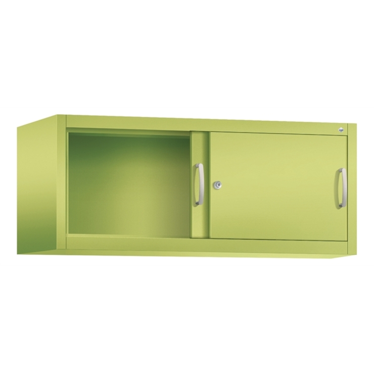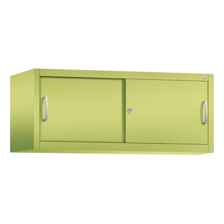 Stahl-Schiebetürenschrank Acurado-2000, als Aufsatzschrank, Korpus aus stabiler Stahlkonstruktion mit hochwertiger Einbrennbeschichtung für hohe UV-Beständigkeit, mit Kunststoffgleitern als praktischer Schrank- und Fußbodenschutz, hohe Flexibilität der Inneneinrichtung durch Höhenverstellbarkeit im 15 mm Raster, Türen verstärkt für hohe Stabilität, leichtgängige Bedienung durch Leichtlaufrollen in spezieller Schienenführung, 1 Wechselzylinder matt vernickelt mit 2 Schlüsseln, 2 Ergonomische Bügelgriffe Ergolock aus Metall für einfache Bedienung, matt vernickelt, Maße (H x B x T): 500 x 1200 x 500 mm, Korpus: 1108060 RDS Viridingrün, Türen: 1108060 RDS Viridingrün
