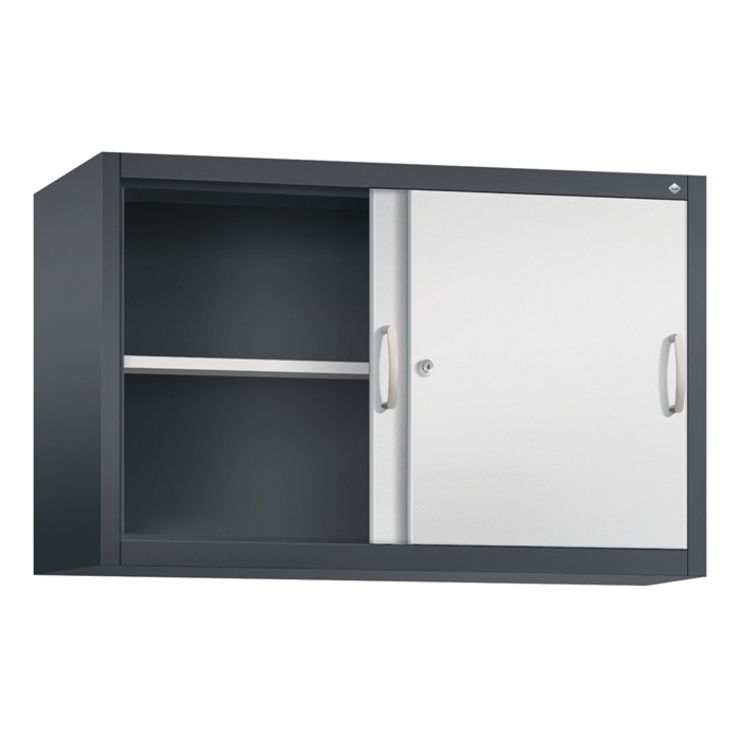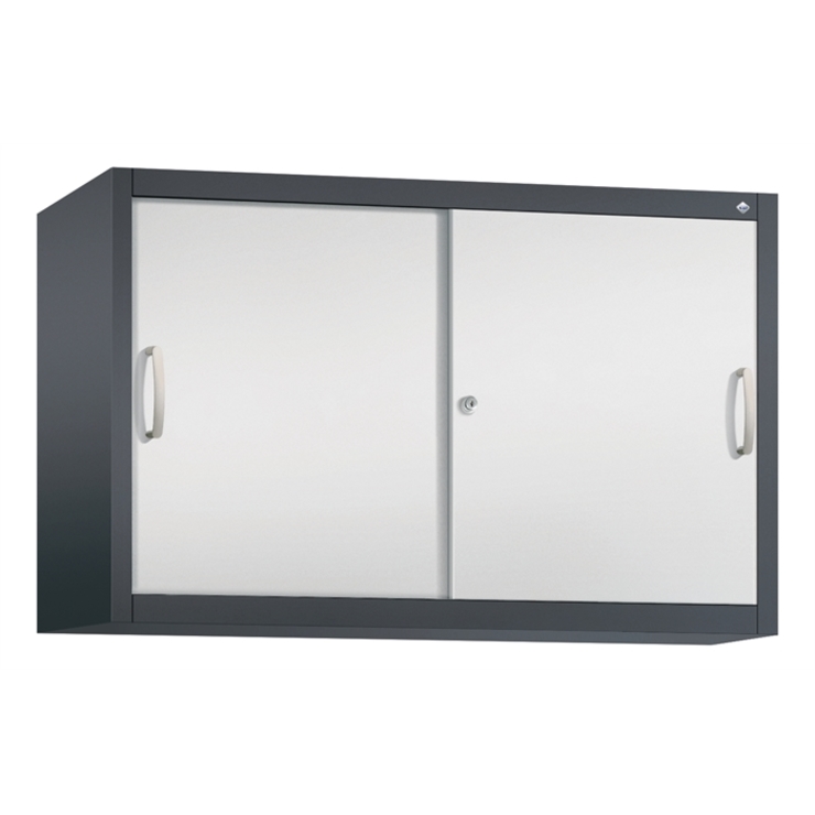 Stahl-Schiebetürenschrank Acurado-2000, als Aufsatzschrank, Korpus aus stabiler Stahlkonstruktion mit hochwertiger Einbrennbeschichtung für hohe UV-Beständigkeit, mit Kunststoffgleitern als praktischer Schrank- und Fußbodenschutz, hohe Flexibilität der Inneneinrichtung durch Höhenverstellbarkeit im 15 mm Raster, Türen verstärkt für hohe Stabilität, leichtgängige Bedienung durch Leichtlaufrollen in spezieller Schienenführung, 1 Wechselzylinder matt vernickelt mit 2 Schlüsseln, 2 Ergonomische Bügelgriffe Ergolock aus Metall für einfache Bedienung, matt vernickelt, 1 Einlegeboden aus Stahl, lackiert, mit hoher Traglast 70 kg, Maße (H x B x T): 790 x 1200 x 400 mm, Korpus: RAL 7021 Schwarzgrau, Türen: RAL 7035 Lichtgrau, Inneneinrichtung: RAL 7035 Lichtgrau