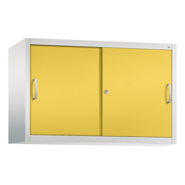 Stahl-Schiebetürenschrank Acurado-2000, als Aufsatzschrank, Korpus aus stabiler Stahlkonstruktion mit hochwertiger Einbrennbeschichtung für hohe UV-Beständigkeit, mit Kunststoffgleitern als praktischer Schrank- und Fußbodenschutz, hohe Flexibilität der Inneneinrichtung durch Höhenverstellbarkeit im 15 mm Raster, Türen verstärkt für hohe Stabilität, leichtgängige Bedienung durch Leichtlaufrollen in spezieller Schienenführung, 1 Wechselzylinder matt vernickelt mit 2 Schlüsseln, 2 Ergonomische Bügelgriffe Ergolock aus Metall für einfache Bedienung, matt vernickelt, 1 Einlegeboden aus Stahl, lackiert, mit hoher Traglast 70 kg, Maße (H x B x T): 790 x 1200 x 400 mm, Korpus: RAL 7035 Lichtgrau, Türen: 0808060 RDS Sonnengelb, Inneneinrichtung: RAL 7035 Lichtgrau