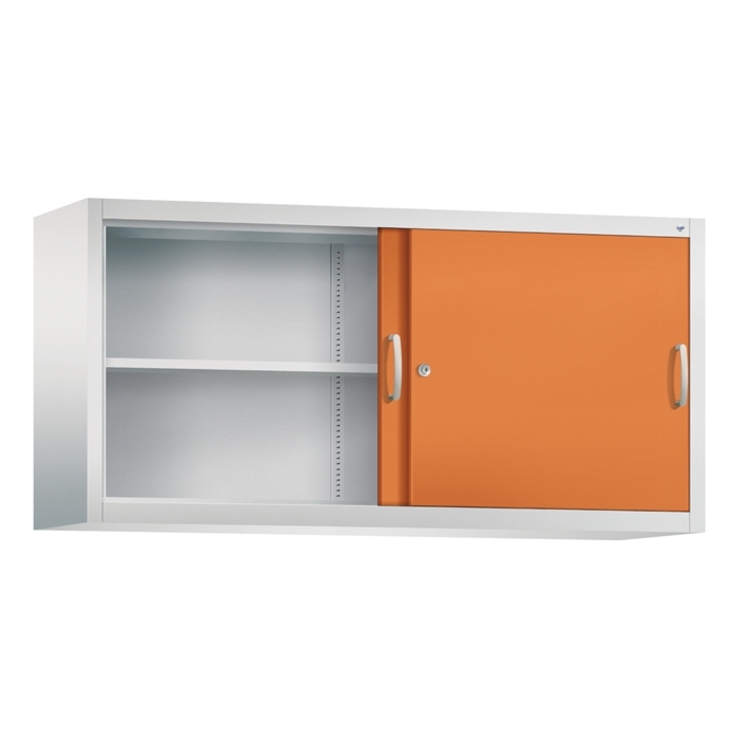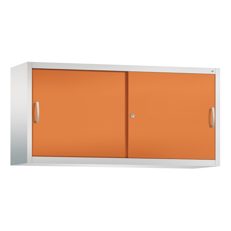Stahl-Schiebetürenschrank Acurado-2000, als Aufsatzschrank, Korpus aus stabiler Stahlkonstruktion mit hochwertiger Einbrennbeschichtung für hohe UV-Beständigkeit, mit Kunststoffgleitern als praktischer Schrank- und Fußbodenschutz, hohe Flexibilität der Inneneinrichtung durch Höhenverstellbarkeit im 15 mm Raster, Türen verstärkt für hohe Stabilität, leichtgängige Bedienung durch Leichtlaufrollen in spezieller Schienenführung, mit Mitteltrennwand, 1 Wechselzylinder matt vernickelt mit 2 Schlüsseln, 2 Ergonomische Bügelgriffe Ergolock aus Metall für einfache Bedienung, matt vernickelt, 2 Einlegeböden aus Stahl, lackiert, mit hoher Traglast 70 kg, Maße (H x B x T): 790 x 1600 x 400 mm, Korpus: RAL 7035 Lichtgrau, Türen: RAL 2000 Gelborange, Inneneinrichtung: RAL 7035 Lichtgrau