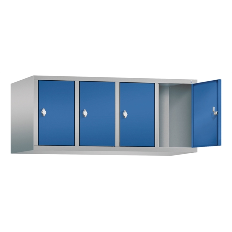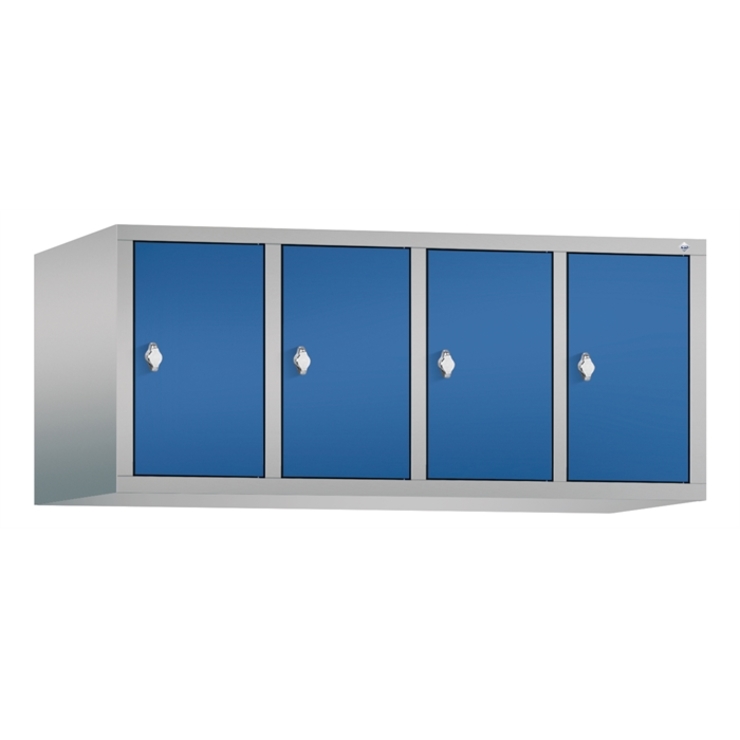 Stahl-Fächerschrank Classic, als Aufsatzschrank, 4 Abteile, Abteilbreite 300 mm, Türenaufhängung oben und unten in Drehbolzen, rechts angeschlagen, 4 Drehriegel für Vorhängeschlösser, Maße (H x B x T): 500 x 1190 x 500 mm, Korpus: RAL 9006 Weißaluminium, Türen Stahl: RAL 5010 Enzianblau