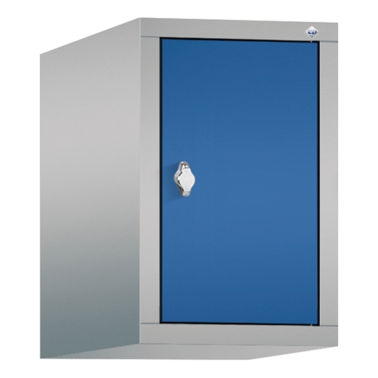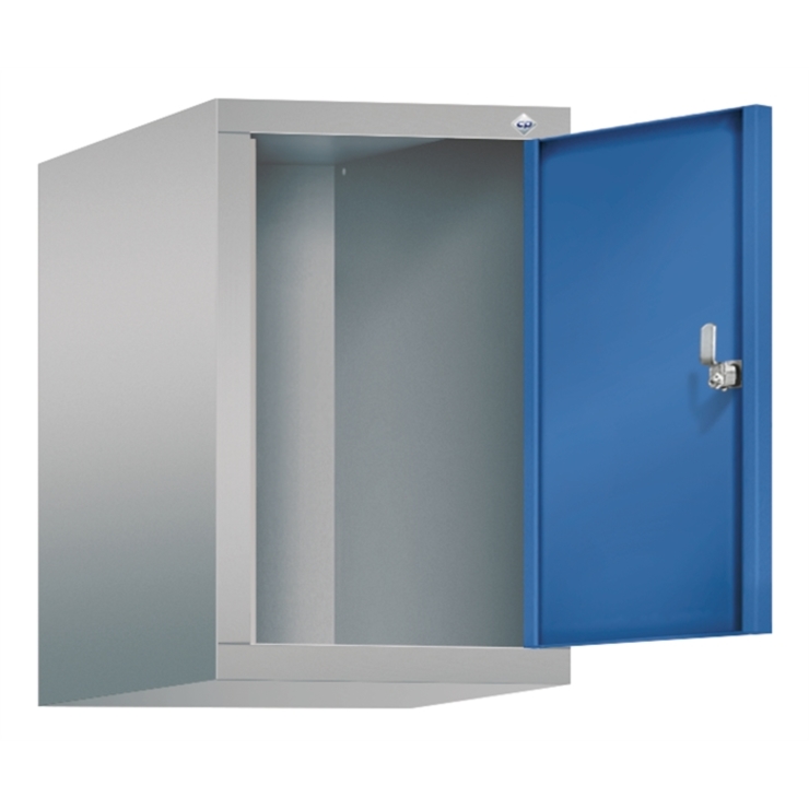 Stahl-Fächerschrank Classic, als Aufsatzschrank, 1 Abteil, Abteilbreite 300 mm, Türaufhängung oben und unten in Drehbolzen, rechts angeschlagen, 1 Drehriegel für Vorhangschloss, Maße (H x B x T): 500 x 320 x 500 mm, Korpus: RAL 9006 Weißaluminium, Türen Stahl: RAL 5010 Enzianblau