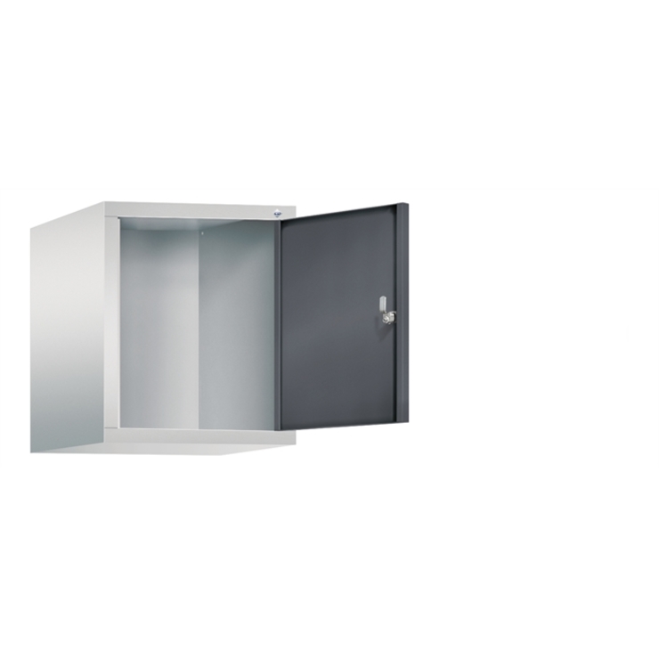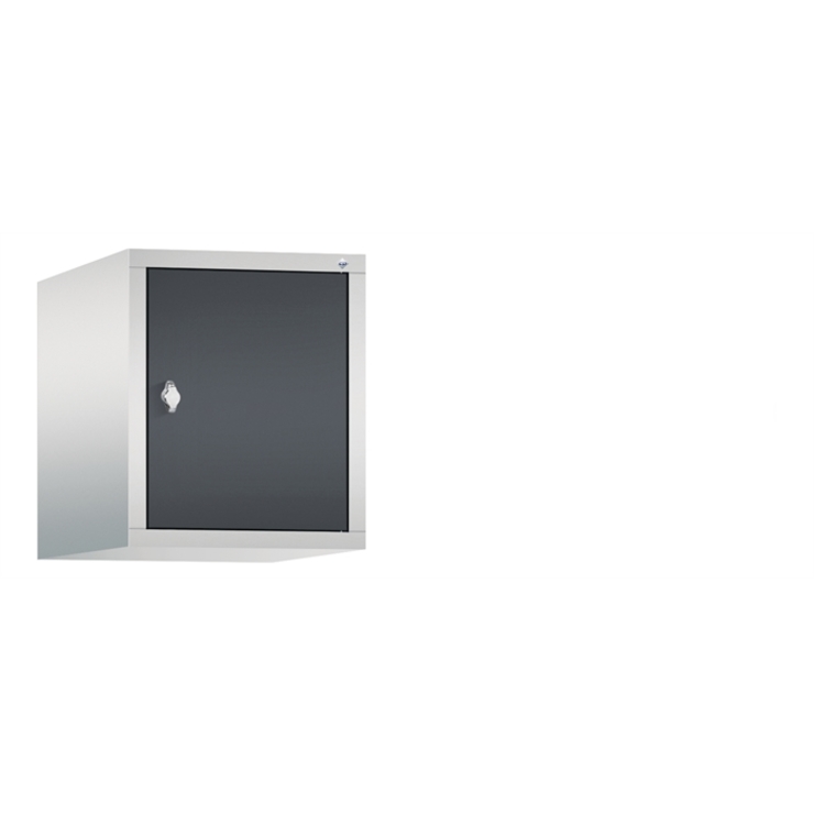 Stahl-Fächerschrank Classic, als Aufsatzschrank, 1 Abteil, Abteilbreite 400 mm, Türaufhängung oben und unten in Drehbolzen, rechts angeschlagen, 1 Drehriegel für Vorhangschloss, Maße (H x B x T): 500 x 420 x 500 mm, Korpus: RAL 7035 Lichtgrau, Türen Stahl: RAL 7021 Schwarzgrau