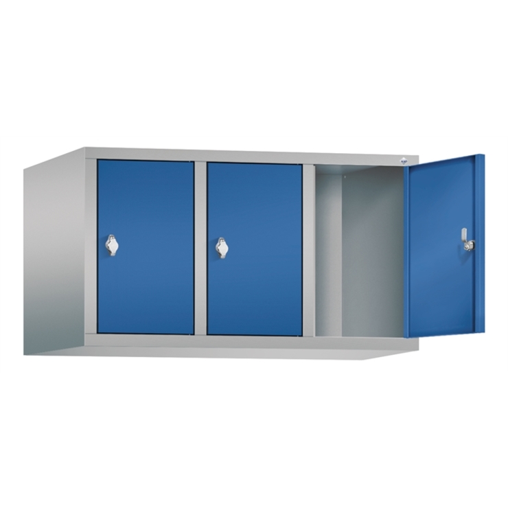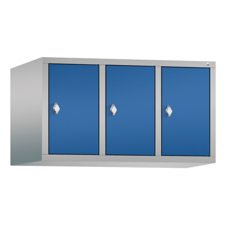 Stahl-Fächerschrank Classic, als Aufsatzschrank, 3 Abteile, Abteilbreite 300 mm, Türenaufhängung oben und unten in Drehbolzen, rechts angeschlagen, 3 Drehriegel für Vorhängeschlösser, Maße (H x B x T): 500 x 900 x 500 mm, Korpus: RAL 9006 Weißaluminium, Türen Stahl: RAL 5010 Enzianblau