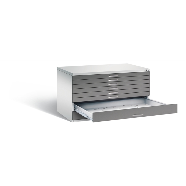Stahl-Schubladenschrank Serie 7100_7200, als Flachablageschrank, Korpus aus stabiler Stahlkonstruktion mit hochwertiger Einbrennbeschichtung für hohe UV-Beständigkeit, mit Kunststoffgleitern als praktischer Schrank- und Fußbodenschutz, 1 Zentralverschluss mit Druckzylinderschloss und 2 Schlüsseln, 3 Ergonomische Bügelgriffe Ergolock aus Metall für einfache Bedienung, matt vernickelt, 3 voll ausziehbare Schubladen, 45 mm hoch, gerastert und unterteilbar für Formate bis DIN A1, hinten... (mehr)? Papersmart hilft Ihnen, den besten Anbieter für Ihren gesamten Warenkorb zu ermitteln.