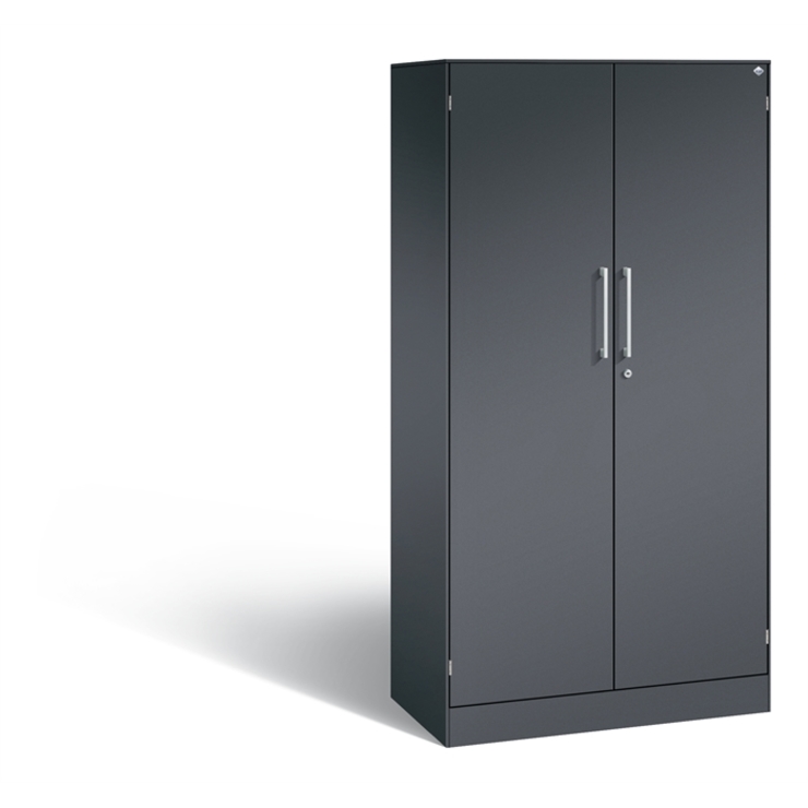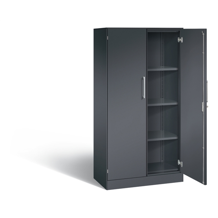Stahl-Flügeltürenschrank Asisto, Korpus aus stabiler Stahlkonstruktion mit filigraner Kantenoptik und hochwertiger Einbrennbeschichtung für hohe UV-Beständigkeit, mit integrierter Niveauregulierung, bequem von innen bedienbar, hohe Flexibilität der Inneneinrichtung durch Höhenverstellbarkeit im 15 mm Raster, 1 Wechselzylinder matt vernickelt mit 2 Schlüsseln, 2 Ergonomische Design-Bügelgriffe für einfache Bedienung, aus Metall, matt vernickelt, 1 Abdeckplatte aus Stahl, 2 Stahltüren doppelwandig, gedämmt für angenehmes Geräuschverhalten, Türaufhängung in innen liegenden Scharnieren mit großzügigem Öffnungswinkel ca. 225 Grad, zueinanderschlagend für gemeinsamen Verschluss, 3 Einlegeböden aus Stahl lackiert, mit hoher Traglast von 70 kg, Maße (H x B x T): 1635 x 800 x 435 mm, Korpus: RAL 7021 Schwarzgrau, Türen: RAL 7021 Schwarzgrau, Inneneinrichtung: RAL 7021 Schwarzgrau