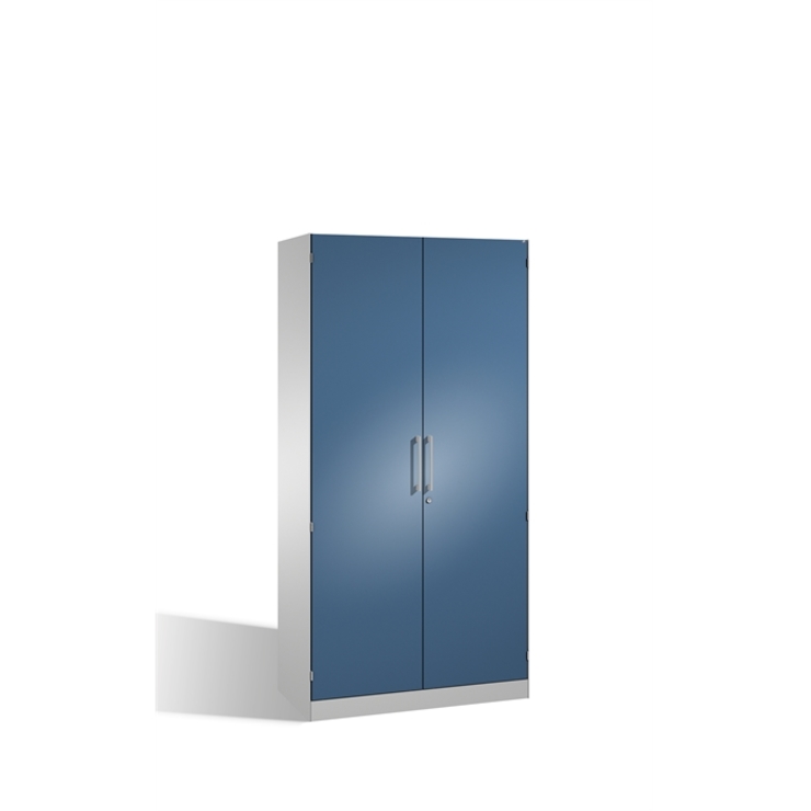 Stahl-Flügeltürenschrank Asisto, Korpus aus stabiler Stahlkonstruktion mit filigraner Kantenoptik und hochwertiger Einbrennbeschichtung für hohe UV-Beständigkeit, mit integrierter Niveauregulierung, bequem von innen bedienbar, hohe Flexibilität der Inneneinrichtung durch Höhenverstellbarkeit im 15 mm Raster, 1 Wechselzylinder matt vernickelt mit 2 Schlüsseln, 2 Ergonomische Design-Bügelgriffe für einfache Bedienung, aus Metall, matt vernickelt, 2 Stahltüren doppelwandig, gedämmt für angenehmes Geräuschverhalten, Türaufhängung in innen liegenden Scharnieren mit großzügigem Öffnungswinkel ca. 225 Grad, zueinanderschlagend für gemeinsamen Verschluss, 4 Einlegeböden aus Stahl lackiert, mit hoher Traglast von 70 kg, Maße (H x B x T): 1980 x 1000 x 435 mm, Korpus: RAL 7035 Lichtgrau, Türen: RAL 5023 Fernblau, Inneneinrichtung: RAL 7021 Schwarzgrau