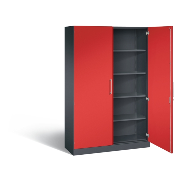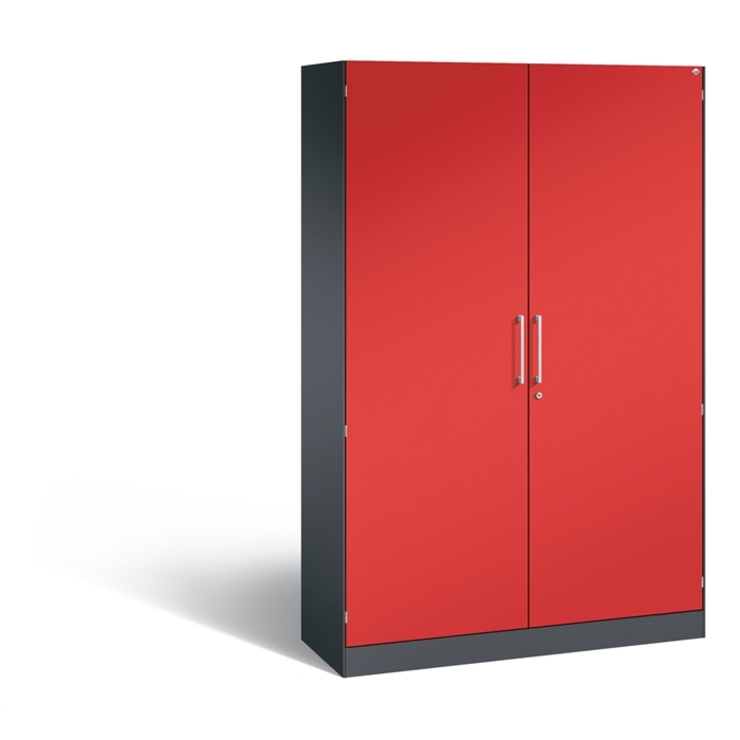 Stahl-Flügeltürenschrank Asisto, Korpus aus stabiler Stahlkonstruktion mit filigraner Kantenoptik und hochwertiger Einbrennbeschichtung für hohe UV-Beständigkeit, mit integrierter Niveauregulierung, bequem von innen bedienbar, hohe Flexibilität der Inneneinrichtung durch Höhenverstellbarkeit im 15 mm Raster, 1 Wechselzylinder matt vernickelt mit 2 Schlüsseln, 2 Ergonomische Design-Bügelgriffe für einfache Bedienung, aus Metall, matt vernickelt, 2 Stahltüren doppelwandig, gedämmt für angenehmes Geräuschverhalten, Türaufhängung in innen liegenden Scharnieren mit großzügigem Öffnungswinkel ca. 225 Grad, zueinanderschlagend für gemeinsamen Verschluss, 4 Einlegeböden aus Stahl lackiert, mit hoher Traglast von 70 kg, Maße (H x B x T): 1980 x 1200 x 435 mm, Korpus: RAL 7021 Schwarzgrau, Türen: RAL 3000 feuerrot, Inneneinrichtung: RAL 7021 Schwarzgrau
