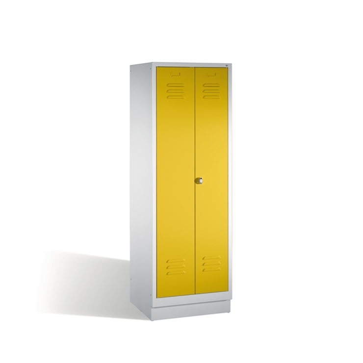 Stahl-Garderobenschrank Classic, mit verkürzter Mitteltrennwand, 2 Abteile, Abteilbreite 300 mm, Korpus aus stabiler Stahlkonstruktion mit hochwertiger Einbrennbeschichtung für hohe UV- und Korrosionsbeständigkeit, Türen zueinanderschlagend für gemeinsamen Verschluss, links 4 fest eingebaute Einlegeböden, stabile Garderobenstange aus Ovalprofil mit 6 verdrehsicheren Schiebehaken, auf 100 mm hohem Sockel, mit Kunststoffgleitern als praktischer Schrank- und Fußbodenschutz, vorne zurückgesetzt und oberhalb mit Luftdurchlass, 1 Drehriegel für Vorhangschloss, Türen mit Anschlagsdämpfer und mittiger Verstärkung für hohe Stabilität, mit Lüftungschlitzen oben und unten sowie eingestanztem Etikettenrahmen, Türaufhängung in Drehbolzen, Maße (H x B x T): 1800 x 610 x 500 mm, Korpus: RAL 7035 Lichtgrau, Türen Stahl: 0808060 RDS Sonnengelb