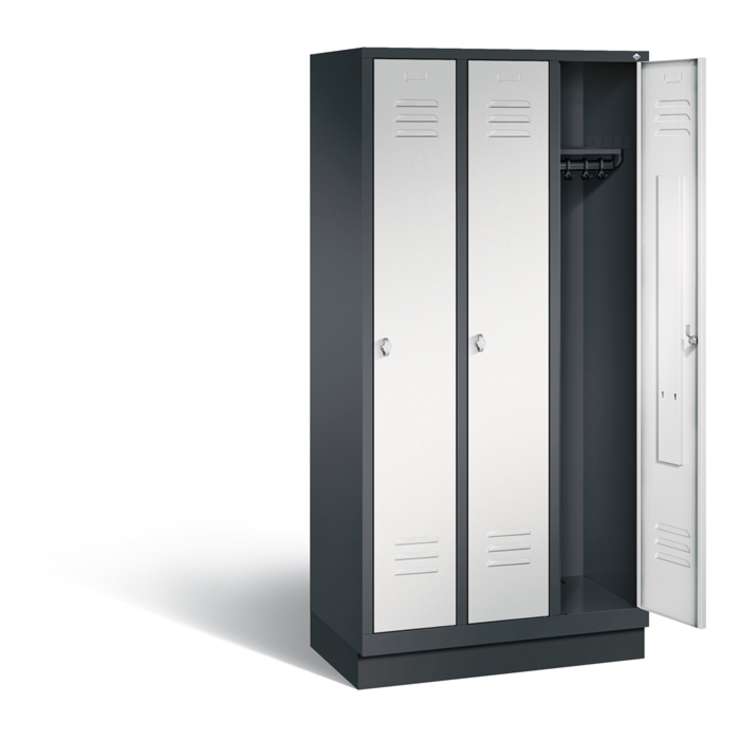 Garderobenschrank Serie Evolo mit 150 mm hohen Füßen, Höhe 1850 mm, lichtgrau/lichtblau • Stabile Stahlblechkonstruktion Erhöhter Korrosionsschutz durch Schrankfüße aus Kunststoff. • Praktische Türen Pro Abteil 2, zueinanderschlagend, mit Anschlagsdämpfer. In Drehbolzen gelagert, mit reinigungsfreundlichem Lochbild und eingeprägtem Etikettenrahmen für integrierbare Nummerierung. Mit Ergonomischen Sicherheits-Drehriegelverschluss zur Verwendung eines Vorhängeschlosses, • Vielseitige... (mehr)? Papersmart hilft Ihnen, den besten Anbieter für Ihren gesamten Warenkorb zu ermitteln.
