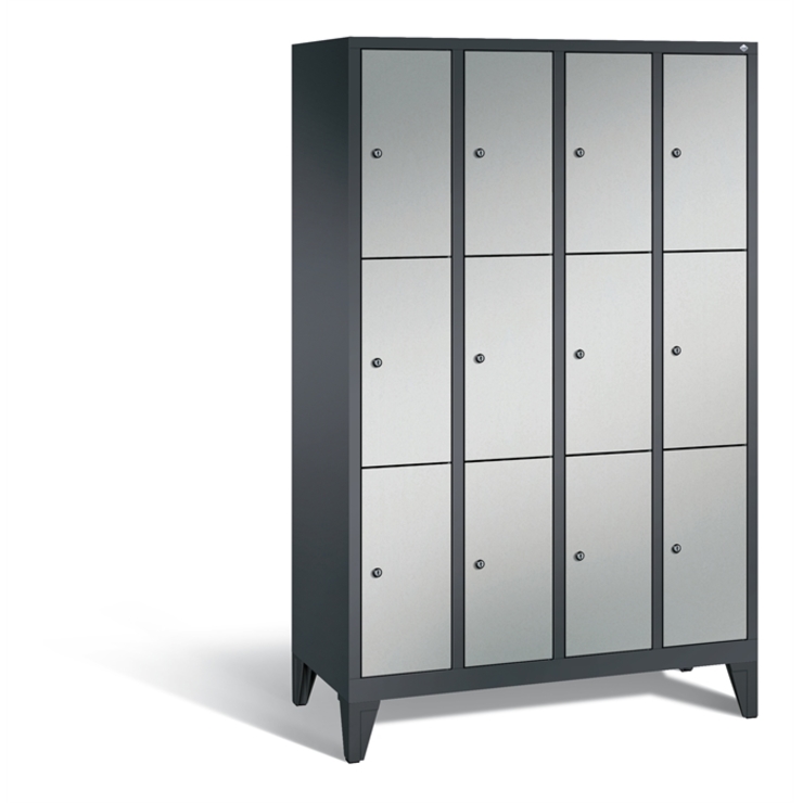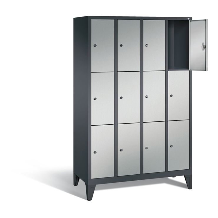 Stahl-Garderobenschrank Classic, 4 Abteile mit 3 Fächern, Abteilbreite 300 mm, Korpus aus stabiler Stahlkonstruktion mit hochwertiger Einbrennbeschichtung für hohe UV- und Korrosionsbeständigkeit, auf 150 mm hohen Füßen aus Kunststoff für erweiterten Korrosionsschutz, 12 Zylinderschlösser mit je 2 Schlüsseln, Schließkreis bis 1000 verschiedene Schließungen, Türen mit Anschlagsdämpfer, Türaufhängung in Drehbolzen, Maße (H x B x T): 1850 x 1190 x 500 mm, Korpus: RAL 7021 Schwarzgrau, Türen Stahl: RAL 9006 Weißaluminium, Füße: RAL 9005 Tiefschwarz