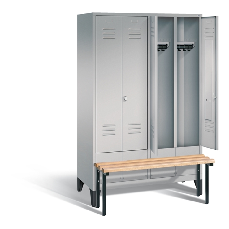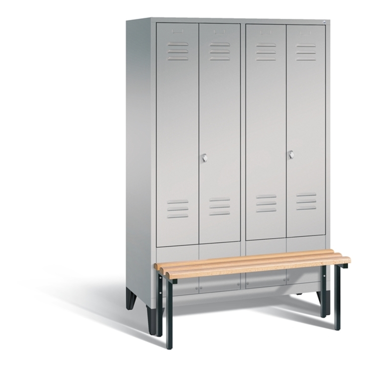 Stahl-Garderobenschrank Classic, 4 Abteile für 2 Personen, Abteilbreite 300 mm,Türen paarweise zueinanderschlagend für gemeinsamen Verschluss, Korpus aus stabiler Stahlkonstruktion mit hochwertiger Einbrennbeschichtung für hohe UV- und Korrosionsbeständigkeit, innen je Abteil 1 Ablageboden, darunter 1 stabile Garderobenstange aus Ovalprofil mit 3 verdrehsicheren Schiebehaken, Schrankboden hinten mit Lüftungsöffnungen für optimale Luftzirkulation, auf 150 mm hohen Füßen aus Kunststoff für optimalen Korrosionsschutz, mit vorgebauter Sitzbank (dadurch Türen verkürzt), Gestell aus stabilem Vierkant-Stahlrohr 30 x 30 mm, mit verstellbaren Bodengleitern für einfachen Niveauausgleich, 2 Drehriegel für Vorhängeschlösser, Türen mit Anschlagsdämpfer und mittiger Verstärkung für hohe Stabilität, mit Lüftungschlitzen oben und unten sowie eingestanztem Etikettenrahmen, Türaufhängung in Drehbolzen, 1 Sitzleisten aus Buche-Hartholz, im Profil ca. 60 x 30 mm, allseitig gehobelt, oben abgerundet für guten Sitzkomfort, klarlackiert mit naturgegebenen Farbunterschieden, Maße (H x B x T): 1850 x 1190 x 500 mm, Korpus: RAL 9006 Weißaluminium, Türen Stahl: RAL 9006 Weißaluminium, Inneneinrichtung: RAL 9006 Weißaluminium, Füße: RAL 9005 Tiefschwarz, Gestell: RAL 7021 Schwarzgrau