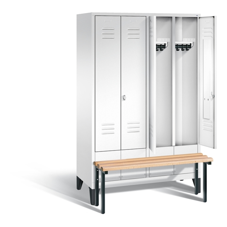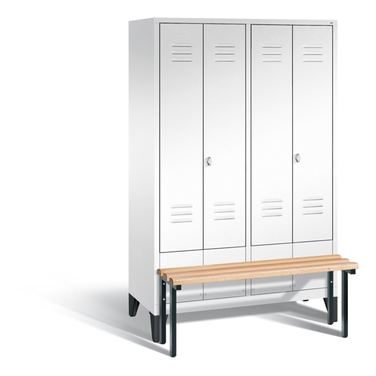 Stahl-Garderobenschrank Classic, 4 Abteile für 2 Personen, Abteilbreite 300 mm,Türen paarweise zueinanderschlagend für gemeinsamen Verschluss, Korpus aus stabiler Stahlkonstruktion mit hochwertiger Einbrennbeschichtung für hohe UV- und Korrosionsbeständigkeit, innen je Abteil 1 Ablageboden, darunter 1 stabile Garderobenstange aus Ovalprofil mit 3 verdrehsicheren Schiebehaken, Schrankboden hinten mit Lüftungsöffnungen für optimale Luftzirkulation, auf 150 mm hohen Füßen aus Kunststoff für optimalen Korrosionsschutz, mit vorgebauter Sitzbank (dadurch Türen verkürzt), Gestell aus stabilem Vierkant-Stahlrohr 30 x 30 mm, mit verstellbaren Bodengleitern für einfachen Niveauausgleich, 2 Drehriegel für Vorhängeschlösser, Türen mit Anschlagsdämpfer und mittiger Verstärkung für hohe Stabilität, mit Lüftungschlitzen oben und unten sowie eingestanztem Etikettenrahmen, Türaufhängung in Drehbolzen, 1 Sitzleisten aus Buche-Hartholz, im Profil ca. 60 x 30 mm, allseitig gehobelt, oben abgerundet für guten Sitzkomfort, klarlackiert mit naturgegebenen Farbunterschieden, Maße (H x B x T): 1850 x 1190 x 500 mm, Korpus: RAL 9016 Verkehrsweiß, Türen Stahl: RAL 9016 Verkehrsweiß, Inneneinrichtung: RAL 9016 Verkehrsweiß, Füße: RAL 9005 Tiefschwarz, Gestell: RAL 7021 Schwarzgrau