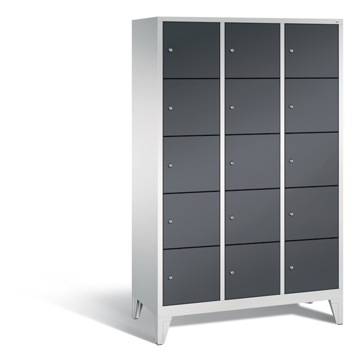 Stahl-Garderobenschrank Classic, 3 Abteile mit 5 Fächern, Abteilbreite 400 mm, Korpus aus stabiler Stahlkonstruktion mit hochwertiger Einbrennbeschichtung für hohe UV- und Korrosionsbeständigkeit, auf 150 mm hohen Füßen aus Kunststoff für erweiterten Korrosionsschutz, 15 Zylinderschlösser mit je 2 Schlüsseln, Schließkreis bis 1000 verschiedene Schließungen, Türen mit Anschlagsdämpfer, Türaufhängung in Drehbolzen, Maße (H x B x T): 1850 x 1200 x 500 mm, Korpus: RAL 7035 Lichtgrau, Türen Stahl: RAL 7021 Schwarzgrau, Füße: RAL 7035 Lichtgrau