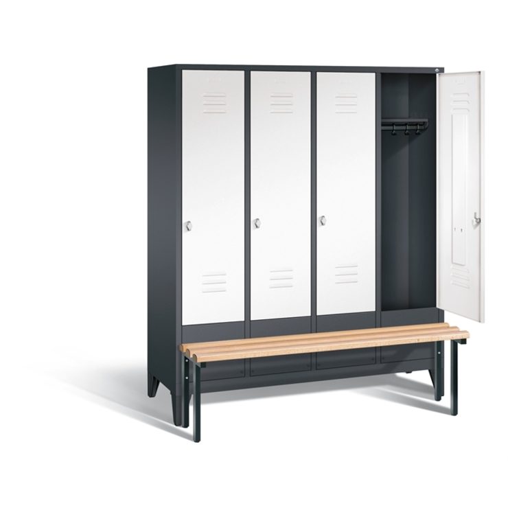 Stahl-Garderobenschrank Classic, 4 Abteile, Abteilbreite 400 mm, Korpus aus stabiler Stahlkonstruktion mit hochwertiger Einbrennbeschichtung für hohe UV- und Korrosionsbeständigkeit, innen je Abteil 1 Ablageboden, darunter 1 stabile Garderobenstange aus Ovalprofil mit 3 verdrehsicheren Schiebehaken, Schrankboden hinten mit Lüftungsöffnungen für optimale Luftzirkulation, auf 150 mm hohen Füßen aus Kunststoff für optimalen Korrosionsschutz, mit vorgebauter Sitzbank (dadurch Türen verkürzt), Gestell aus stabilem Vierkant-Stahlrohr 30 x 30 mm, mit verstellbaren Bodengleitern für einfachen Niveauausgleich, 4 Drehriegel für Vorhängeschlösser, Türen mit Anschlagsdämpfer und mittiger Verstärkung für hohe Stabilität, mit Lüftungschlitzen oben und unten sowie eingestanztem Etikettenrahmen, Türaufhängung in Drehbolzen, 1 Sitzleisten aus Buche-Hartholz, im Profil ca. 60 x 30 mm, allseitig gehobelt, oben abgerundet für guten Sitzkomfort, klarlackiert mit naturgegebenen Farbunterschieden, Maße (H x B x T): 1850 x 1590 x 500 mm, Korpus: RAL 7021 Schwarzgrau, Türen Stahl: RAL 9016 Verkehrsweiß, Inneneinrichtung: RAL 7021 Schwarzgrau, Füße: RAL 9005 Tiefschwarz, Gestell: RAL 7021 Schwarzgrau