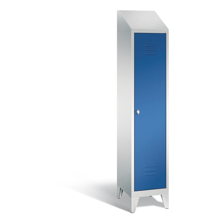 Stahl-Garderobenschrank Classic, 1 Abteil, Abteilbreite 400 mm, Korpus aus stabiler Stahlkonstruktion mit hochwertiger Einbrennbeschichtung für hohe UV- und Korrosionsbeständigkeit, innen je Abteil 1 Ablageboden, darunter 1 stabile Garderobenstange aus Ovalprofil mit 3 verdrehsicheren Schiebehaken, Schrankboden hinten mit Lüftungsöffnungen für optimale Luftzirkulation, auf 150 mm hohen Füßen aus Kunststoff für erweiterten Korrosionsschutz, 1 Drehriegel für Vorhangschloss, Tür mit Anschlagsdämpfer und mittiger Verstärkung für hohe Stabilität, mit Lüftungschlitzen oben und unten sowie eingestanztem Etikettenrahmen, Türaufhängung in Drehbolzen, 1 Schrägdachaufsatz mit 26 Grad Neigung, verhindert das Liegenbleiben von Gegenständen, Maße (H x B x T): 1850 x 420 x 500 mm, Korpus: RAL 7035 Lichtgrau, Türen Stahl: RAL 5010 Enzianblau, Inneneinrichtung: RAL 7035 Lichtgrau, Füße: RAL 7035 Lichtgrau, Schrägdach: RAL 7035 Lichtgrau