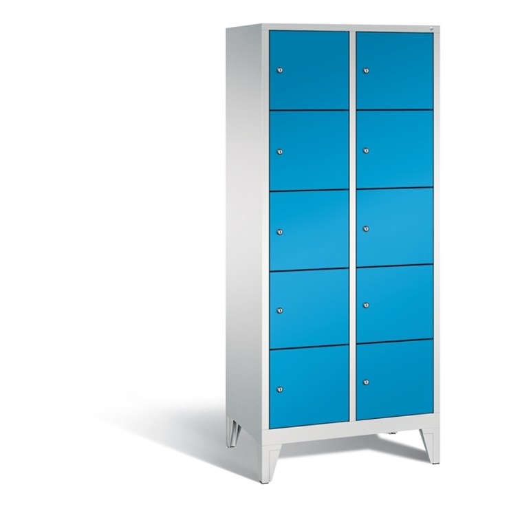Stahl-Garderobenschrank Classic, 2 Abteile mit 5 Fächern, Abteilbreite 400 mm, Korpus aus stabiler Stahlkonstruktion mit hochwertiger Einbrennbeschichtung für hohe UV- und Korrosionsbeständigkeit, auf 150 mm hohen Füßen aus Kunststoff für erweiterten Korrosionsschutz, 10 Zylinderschlösser mit je 2 Schlüsseln, Schließkreis bis 1000 verschiedene Schließungen, Türen mit Anschlagsdämpfer, Türaufhängung in Drehbolzen, Maße (H x B x T): 1850 x 810 x 500 mm, Korpus: RAL 7035 Lichtgrau, Türen Stahl: RAL 5012 Lichtblau, Füße: RAL 7035 Lichtgrau