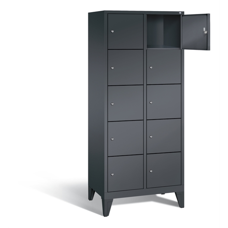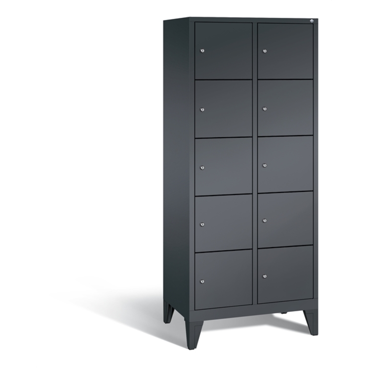 Stahl-Garderobenschrank Classic, 2 Abteile mit 5 Fächern, Abteilbreite 400 mm, Korpus aus stabiler Stahlkonstruktion mit hochwertiger Einbrennbeschichtung für hohe UV- und Korrosionsbeständigkeit, auf 150 mm hohen Füßen aus Kunststoff für erweiterten Korrosionsschutz, 10 Zylinderschlösser mit je 2 Schlüsseln, Schließkreis bis 1000 verschiedene Schließungen, Türen mit Anschlagsdämpfer, Türaufhängung in Drehbolzen, Maße (H x B x T): 1850 x 810 x 500 mm, Korpus: RAL 7021 Schwarzgrau, Türen Stahl: RAL 7021 Schwarzgrau, Füße: RAL 9005 Tiefschwarz
