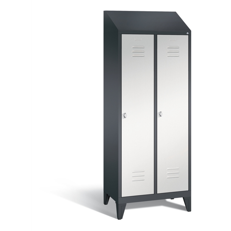 Stahl-Garderobenschrank Classic, 2 Abteile, Abteilbreite 400 mm, Korpus aus stabiler Stahlkonstruktion mit hochwertiger Einbrennbeschichtung für hohe UV- und Korrosionsbeständigkeit, innen je Abteil 1 Ablageboden, darunter 1 stabile Garderobenstange aus Ovalprofil mit 3 verdrehsicheren Schiebehaken, Schrankboden hinten mit Lüftungsöffnungen für optimale Luftzirkulation, auf 150 mm hohen Füßen aus Kunststoff für erweiterten Korrosionsschutz, 2 Drehriegel für Vorhängeschlösser, Türen mit Anschlagsdämpfer und mittiger Verstärkung für hohe Stabilität, mit Lüftungschlitzen oben und unten sowie eingestanztem Etikettenrahmen, Türaufhängung in Drehbolzen, 1 Schrägdachaufsatz mit 26 Grad Neigung, verhindert das Liegenbleiben von Gegenständen, Maße (H x B x T): 1850 x 810 x 500 mm, Korpus: RAL 7021 Schwarzgrau, Türen Stahl: RAL 7035 Lichtgrau, Inneneinrichtung: RAL 7021 Schwarzgrau, Füße: RAL 9005 Tiefschwarz, Schrägdach: RAL 7021 Schwarzgrau