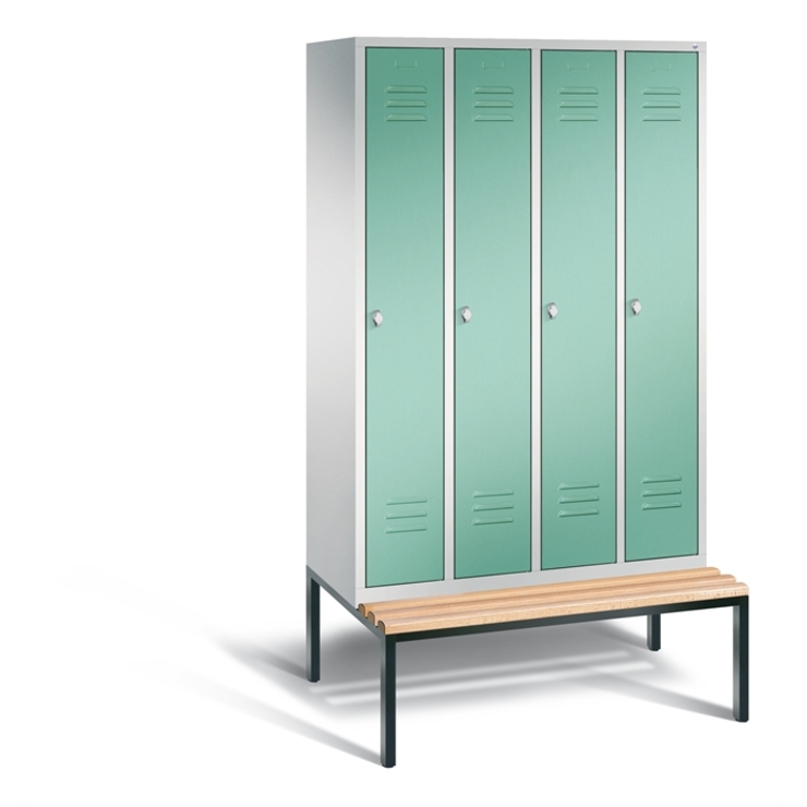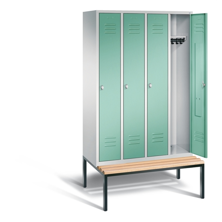 Doppelstöckiger Stahl-Garderobenschrank Evolo, 2 Abteile mit je 2 Fächern, Abteilbreite 300 mm, Korpus aus stabiler Stahlkonstruktion mit hochwertiger Einbrennbeschichtung für hohe UV- und Korrosionsbeständigkeit, innen je Fach 1 Ablageboden, darunter 1 stabile Garderobenstange aus Ovalprofil mit 3 verdrehsicheren Schiebehaken, auf untergebauter Sitzbank, Gestell aus stabilem Vierkant-Stahlrohr 30 x 30 mm, mit verstellbaren Bodengleitern für einfachen Niveauausgleich, 4 Ergonomische... (mehr)? Papersmart hilft Ihnen, den besten Anbieter für Ihren gesamten Warenkorb zu ermitteln.