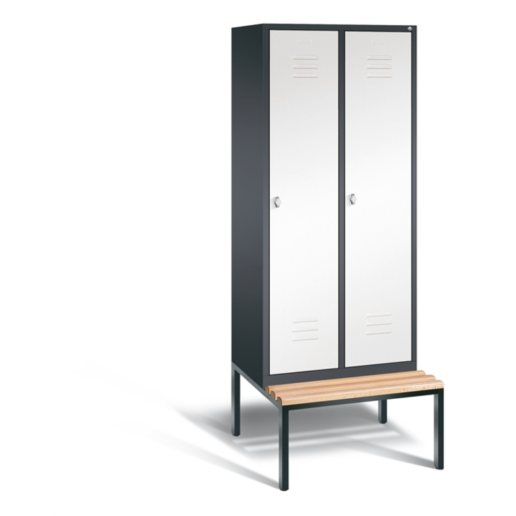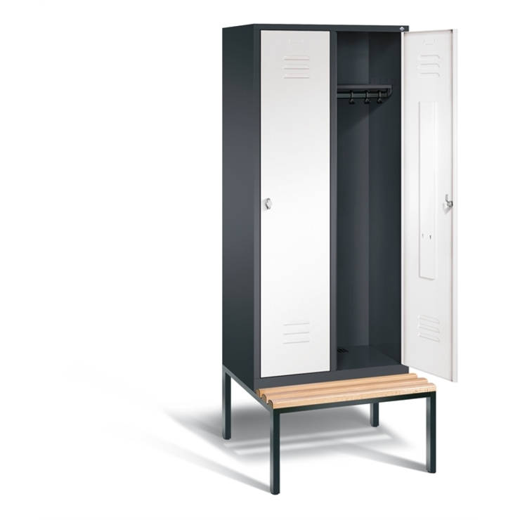 Stahl-Garderobenschrank Classic, 2 Abteile, Abteilbreite 400 mm, Korpus aus stabiler Stahlkonstruktion mit hochwertiger Einbrennbeschichtung für hohe UV- und Korrosionsbeständigkeit, innen je Abteil 1 Ablageboden, darunter 1 stabile Garderobenstange aus Ovalprofil mit 3 verdrehsicheren Schiebehaken, Schrankboden hinten mit Lüftungsöffnungen für optimale Luftzirkulation, auf untergebauter Sitzbank, Gestell aus stabilem Vierkant-Stahlrohr 30 x 30 mm, mit verstellbaren Bodengleitern für einfachen Niveauausgleich, 2 Drehriegel für Vorhängeschlösser, Türen mit Anschlagsdämpfer und mittiger Verstärkung für hohe Stabilität, mit Lüftungschlitzen oben und unten sowie eingestanztem Etikettenrahmen, Türaufhängung in Drehbolzen, 1 Sitzleisten aus Buche-Hartholz, im Profil ca. 60 x 30 mm, allseitig gehobelt, oben abgerundet für guten Sitzkomfort, klarlackiert mit naturgegebenen Farbunterschieden, 1 Maße (H x B x T): 2090 x 810 x 815 mm, Korpus: RAL 7021 Schwarzgrau, Türen Stahl: RAL 9016 Verkehrsweiß, Inneneinrichtung: RAL 7021 Schwarzgrau, Gestell: RAL 7021 Schwarzgrau