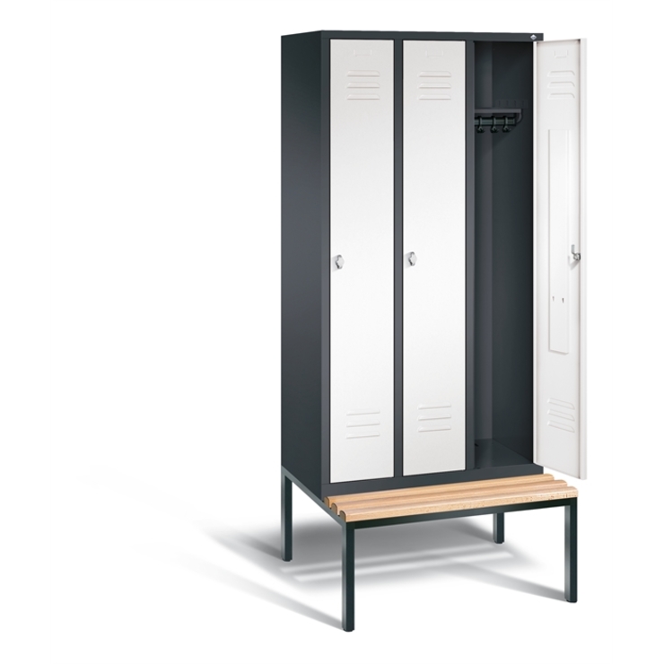 Stahl-Garderobenschrank Classic, 3 Abteile, Abteilbreite 300 mm, Korpus aus stabiler Stahlkonstruktion mit hochwertiger Einbrennbeschichtung für hohe UV- und Korrosionsbeständigkeit, innen je Abteil 1 Ablageboden, darunter 1 stabile Garderobenstange aus Ovalprofil mit 3 verdrehsicheren Schiebehaken, Schrankboden hinten mit Lüftungsöffnungen für optimale Luftzirkulation, auf untergebauter Sitzbank, Gestell aus stabilem Vierkant-Stahlrohr 30 x 30 mm, mit verstellbaren Bodengleitern für einfachen Niveauausgleich, 3 Drehriegel für Vorhängeschlösser, Türen mit Anschlagsdämpfer und mittiger Verstärkung für hohe Stabilität, mit Lüftungschlitzen oben und unten sowie eingestanztem Etikettenrahmen, Türaufhängung in Drehbolzen, 1 Sitzleisten aus Buche-Hartholz, im Profil ca. 60 x 30 mm, allseitig gehobelt, oben abgerundet für guten Sitzkomfort, klarlackiert mit naturgegebenen Farbunterschieden, 1 Maße (H x B x T): 2090 x 900 x 815 mm, Korpus: RAL 7021 Schwarzgrau, Türen Stahl: RAL 9016 Verkehrsweiß, Inneneinrichtung: RAL 7021 Schwarzgrau, Gestell: RAL 7021 Schwarzgrau
