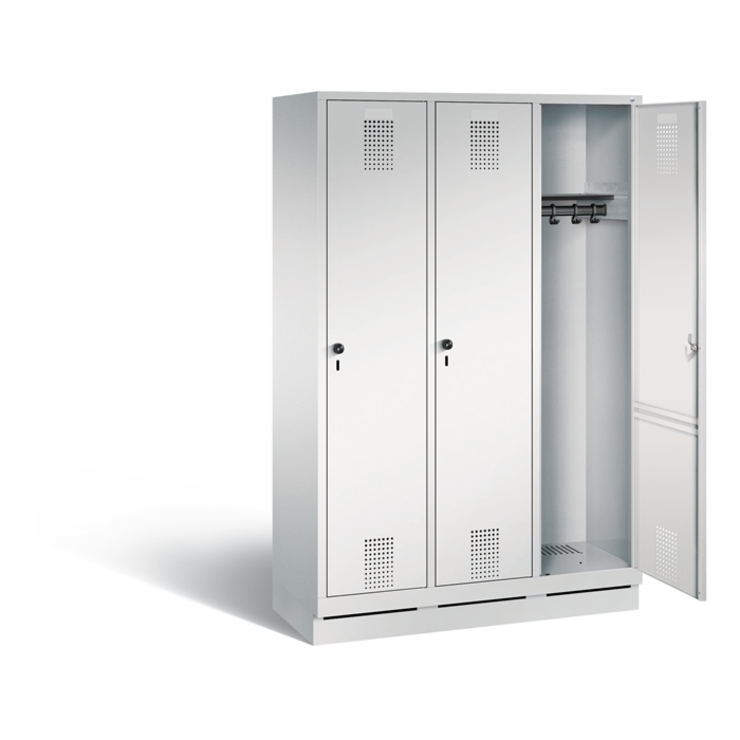 Stahl-Garderobenschrank Evolo, als Straßen- und Berufskleidungsschrank, 4 Abteile für 2 Personen, Abteilbreite 300 mm, je 1 Tür über 2 Abteile, rechts angeschlagen, Korpus aus stabiler Stahlkonstruktion mit hochwertiger Einbrennbeschichtung für hohe UV- und Korrosionsbeständigkeit, innen je Abteil 1 Ablageboden, darunter 1 stabile Garderobenstange aus Ovalprofil mit 3 verdrehsicheren Schiebehaken, Schrankboden hinten mit großflächigem Luftdurchlass für optimale Luftzirkulation, auf 150... (mehr)? Papersmart hilft Ihnen, den besten Anbieter für Ihren gesamten Warenkorb zu ermitteln.