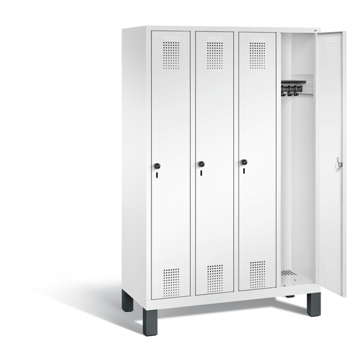 Stahl-Garderobenschrank Evolo, 4 Abteile, Abteilbreite 300 mm, Korpus aus stabiler Stahlkonstruktion mit hochwertiger Einbrennbeschichtung für hohe UV- und Korrosionsbeständigkeit, innen je Abteil 1 Ablageboden, darunter 1 stabile Garderobenstange aus Ovalprofil mit 3 verdrehsicheren Schiebehaken, Schrankboden hinten mit großflächigem Luftdurchlass für optimale Luftzirkulation, auf 150 mm hohen Füßen aus Kunststoff für erweiterten Korrosionsschutz, mit integrierter Niveauregulierung und Schutzhülsen zur stilvollen Abdeckung der Verstellschrauben, bequem von innen und außen verstellbar, 4 Ergonomische Sicherheits-Drehriegel für Vorhängeschlösser inkl. Tür-Schutz, Türen mit Anschlagsdämpfer und geschlossenen Seitenprofilen für höchste Stabilität und Einbruchsicherheit, mit reinigungsfreundlichem Belüftungslochbild oben und unten sowie eingeprägtem Etikettenrahmen, Türaufhängung in Drehbolzen, Maße (H x B x T): 1850 x 1190 x 500 mm, Korpus: RAL 9016 Verkehrsweiß, Türen Stahl: RAL 9016 Verkehrsweiß, Füße: RAL 9005 Tiefschwarz, Inneneinrichtung: RAL 7021 Schwarzgrau