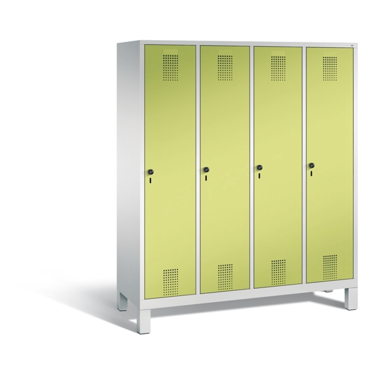 Stahl-Garderobenschrank Evolo, 4 Abteile, Abteilbreite 400 mm, Korpus aus stabiler Stahlkonstruktion mit hochwertiger Einbrennbeschichtung für hohe UV- und Korrosionsbeständigkeit, innen je Abteil 1 Ablageboden, darunter 1 stabile Garderobenstange aus Ovalprofil mit 3 verdrehsicheren Schiebehaken, Schrankboden hinten mit großflächigem Luftdurchlass für optimale Luftzirkulation, auf 150 mm hohen Füßen aus Kunststoff für erweiterten Korrosionsschutz, mit integrierter Niveauregulierung und Schutzhülsen zur stilvollen Abdeckung der Verstellschrauben, bequem von innen und außen verstellbar, 4 Ergonomische Sicherheits-Drehriegel für Vorhängeschlösser inkl. Tür-Schutz, Türen mit Anschlagsdämpfer und geschlossenen Seitenprofilen für höchste Stabilität und Einbruchsicherheit, mit reinigungsfreundlichem Belüftungslochbild oben und unten sowie eingeprägtem Etikettenrahmen, Türaufhängung in Drehbolzen, Maße (H x B x T): 1850 x 1590 x 500 mm, Korpus: RAL 7035 Lichtgrau, Türen Stahl: 1108060 RDS Viridingrün, Füße: RAL 7035 Lichtgrau, Inneneinrichtung: RAL 7021 Schwarzgrau