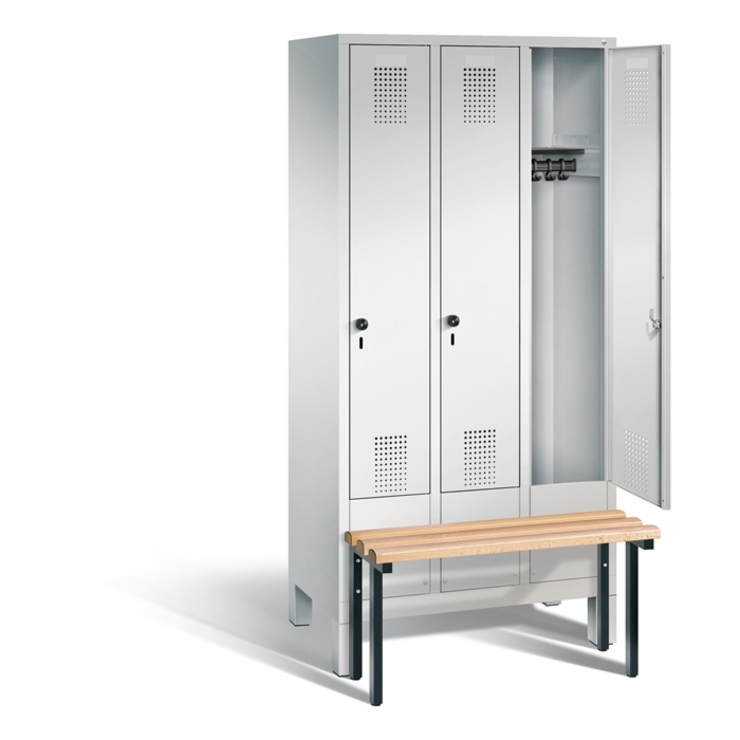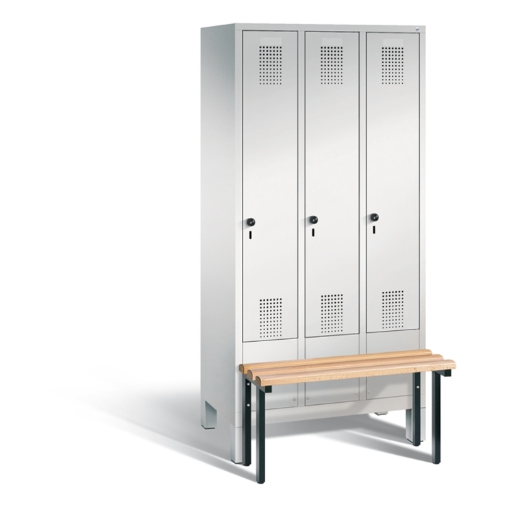 Stahl-Garderobenschrank Evolo, 3 Abteile, Abteilbreite 400 mm, Korpus aus stabiler Stahlkonstruktion mit hochwertiger Einbrennbeschichtung für hohe UV- und Korrosionsbeständigkeit, innen je Abteil 1 Ablageboden, darunter 1 stabile Garderobenstange aus Ovalprofil mit 3 verdrehsicheren Schiebehaken, Schrankboden hinten mit großflächigem Luftdurchlass für optimale Luftzirkulation, auf 100 mm hohem Sockel, mit Kunststoffgleitern als praktischer Schrank- und Fußbodenschutz, vorne... (mehr)? Papersmart hilft Ihnen, den besten Anbieter für Ihren gesamten Warenkorb zu ermitteln.