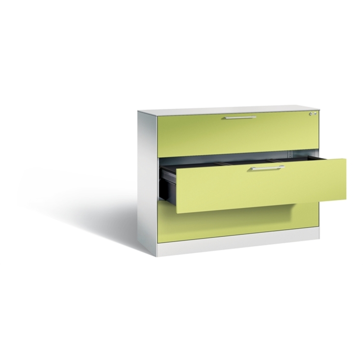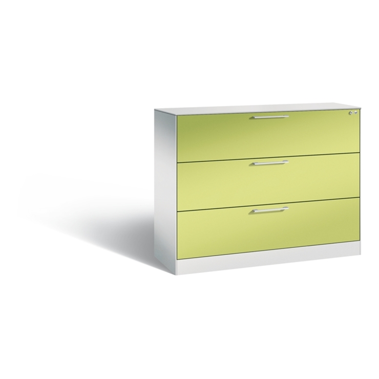 Stahl-Schubladenschrank Asisto, als Hängeregistraturschrank, Korpus aus stabiler Stahlkonstruktion, körperschallgedämpft für angenehmes Geräuschverhalten, mit filigraner Kantenoptik und hochwertiger Einbrennbeschichtung für hohe UV- Beständigkeit, mit integrierter Niveauregulierung von innen bedienbar, 3 voll ausziehbare Schubladen, 3-bahnig, für Hängehefter DIN A4, auf langlebigen Teleskopschienen mit Parallelsteuerung, End-Selbst-Einzug und Auszugsperre, hohe Traglast 50 Kg je Schublade, 1 Wechselzylinder matt vernickelt mit 2 Schlüsseln, 3 Ergonomische Design-Bügelgriffe für einfache Bedienung, aus Metall, matt vernickelt, 1 selbstklebender Kunststoff-Etikettenrahmen, zur Ergänzung der beiliegenden Beschriftungsschilder, inkl. Etikett und Klarsicht-Abdeckung, Set bestehend aus 3 Stück, 1 Schubladenblenden aus Stahl, 2 Schubladenblenden aus Stahl, 1 Abdeckplatte aus Stahl, Maße (H x B x T): 1010 x 1200 x 435 mm, Korpus: RAL 7035 Lichtgrau, Blenden: 1108060 RDS Viridingrün, Inneneinrichtung: RAL 7021 Schwarzgrau