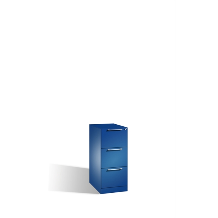 Stahl-Schubladenschrank Asisto, als Hängeregistraturschrank, Korpus aus stabiler Stahlkonstruktion, körperschallgedämpft für angenehmes Geräuschverhalten, mit filigraner Kantenoptik und hochwertiger Einbrennbeschichtung für hohe UV- Beständigkeit, mit integrierter Niveauregulierung von innen bedienbar, 3 voll ausziehbare Schubladen, 1-bahnig, für Hängehefter DIN A4 quer, 1 Wechselzylinder matt vernickelt mit 2 Schlüsseln, 3 Ergonomische Design-Bügelgriffe für einfache Bedienung, aus Metall, matt vernickelt, 1 selbstklebender Kunststoff-Etikettenrahmen, zur Ergänzung der beiliegenden Beschriftungsschilder, inkl. Etikett und Klarsicht-Abdeckung, Set bestehend aus 3 Stück, 1 Schubladenblenden aus Stahl, 2 Schubladenblenden aus direktbeschichteter Spanplatte (DBS), 1 filigrane Stahl-Abdeckplatte, schallgedämmt Maße (H x B x T): 1010 x 440 x 600 mm, Korpus: RAL 5010 Enzianblau, Blenden: RAL 5010 Enzianblau, Inneneinrichtung: RAL 7021 Schwarzgrau