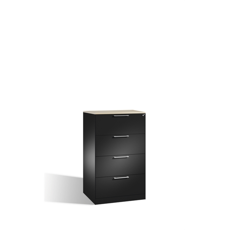 Stahl-Schubladenschrank Asisto, als Hängeregistraturschrank, Korpus aus stabiler Stahlkonstruktion, körperschallgedämpft für angenehmes Geräuschverhalten, mit filigraner Kantenoptik und hochwertiger Einbrennbeschichtung für hohe UV- Beständigkeit, mit integrierter Niveauregulierung von innen bedienbar, 4 voll ausziehbare Schubladen, 2-bahnig, für Hängehefter DIN A4 quer, 1 Wechselzylinder matt vernickelt mit 2 Schlüsseln, 4 Ergonomische Design-Bügelgriffe für einfache Bedienung, aus Metall, matt vernickelt, 1 selbstklebender Kunststoff-Etikettenrahmen, zur Ergänzung der beiliegenden Beschriftungsschilder, inkl. Etikett und Klarsicht-Abdeckung, Set bestehend aus 4 Stück, 1 Schubladenblenden aus Stahl, 3 Schubladenblenden aus Stahl, 1 Abdeckplatte 25 mm aus direktbeschichteter Spanplatte (DBS), Maße (H x B x T): 1310 x 800 x 600 mm, Korpus: RAL 7021 Schwarzgrau, Blenden: RAL 7021 Schwarzgrau, Inneneinrichtung: RAL 7021 Schwarzgrau, Abdeckplatte DBS: Dekor Ahorn