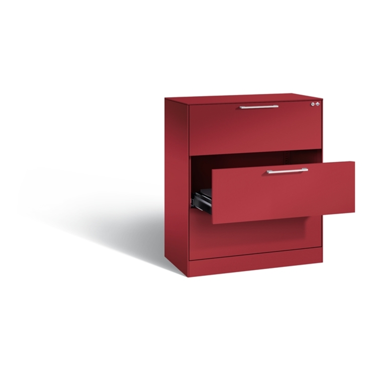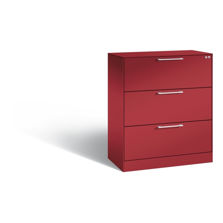Stahl-Schubladenschrank Asisto, als Karteischrank, Korpus aus stabiler Stahlkonstruktion, körperschallgedämpft für angenehmes Geräuschverhalten, mit filigraner Kantenoptik und hochwertiger Einbrennbeschichtung für hohe UV- Beständigkeit, mit integrierter Niveauregulierung von innen bedienbar, 3 voll ausziehbare Schubladen, 4-bahnig, für Karteikarten DIN A5 hoch, mit 2 verstellbaren Pendelblechen je Bahn, auf langlebigen Teleskopschienen mit Parallelsteuerung, End-Selbst-Einzug und Auszugsperre, hohe Traglast 50 Kg je Schublade, 1 Wechselzylinder matt vernickelt mit 2 Schlüsseln, 3 Ergonomische Design-Bügelgriffe für einfache Bedienung, aus Metall, matt vernickelt, 1 selbstklebender Kunststoff-Etikettenrahmen, zur Ergänzung der beiliegenden Beschriftungsschilder, inkl. Etikett und Klarsicht-Abdeckung, Set bestehend aus 3 Stück, 1 Schubladenblenden aus Stahl, 2 Schubladenblenden aus Stahl, 1 Abdeckplatte aus Stahl, Maße (H x B x T): 1010 x 800 x 435 mm, Korpus: RAL 3003 Rubinrot, Blenden: RAL 3003 Rubinrot, Inneneinrichtung: RAL 7021 Schwarzgrau