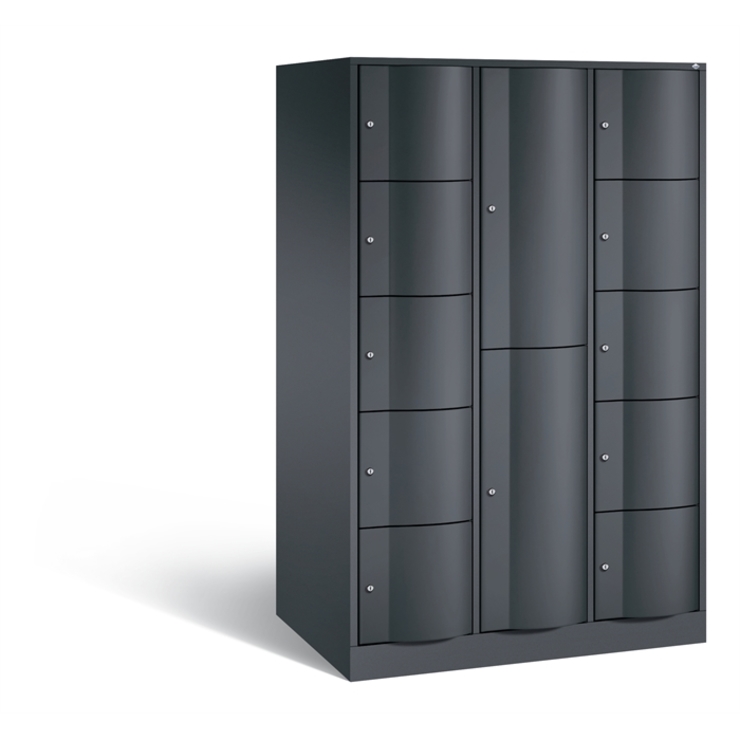Stahl-Kombinations-Schließfachschrank Resisto, als Großraumschrank 3 Abteile mit 5 + 2 + 5 Fächern, Spezialtüren aus 1,5 mm Stahl, mit Wölbung nach vorne, absolut stabil und vandalismussicher, Türaufhängung durchgängig mit robustem Drehstangen-Scharnier, rechts angeschlagen, mit Belüftungs-Lochbild in der Rückwand und 20 mm Wandabstandhalter, auf 100 mm hohem Sockel mit 30 mm Niveauregulierung, innen pro großem Fach eine stabile Garderobenstange aus Ovalprofil mit 3 verdrehsicheren Schiebehaken 12 Drehzylinderschlösser mit 2 Schlüsseln, Schließkreis bis 6000 verschiedene Schließungen, Maße (H x B x T): 1950 x 1148 x 740 mm, Korpus: RAL 7021 Schwarzgrau, Türen: RAL 7021 Schwarzgrau