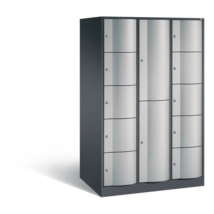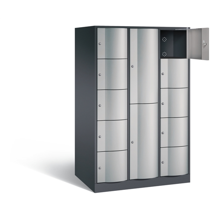 Stahl-Kombinations-Schließfachschrank Resisto, als Großraumschrank 3 Abteile mit 5 + 2 + 5 Fächern, Spezialtüren aus 1,5 mm Stahl, mit Wölbung nach vorne, absolut stabil und vandalismussicher, Türaufhängung durchgängig mit robustem Drehstangen-Scharnier, rechts angeschlagen, mit Belüftungs-Lochbild in der Rückwand und 20 mm Wandabstandhalter, auf 100 mm hohem Sockel mit 30 mm Niveauregulierung, innen pro großem Fach eine stabile Garderobenstange aus Ovalprofil mit 3 verdrehsicheren Schiebehaken 12 Drehzylinderschlösser mit 2 Schlüsseln, Schließkreis bis 6000 verschiedene Schließungen, Maße (H x B x T): 1950 x 1148 x 740 mm, Korpus: RAL 7021 Schwarzgrau, Türen: RAL 9006 Weißaluminium